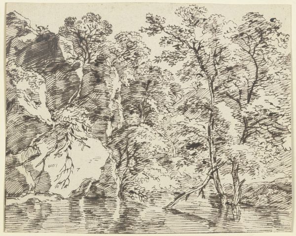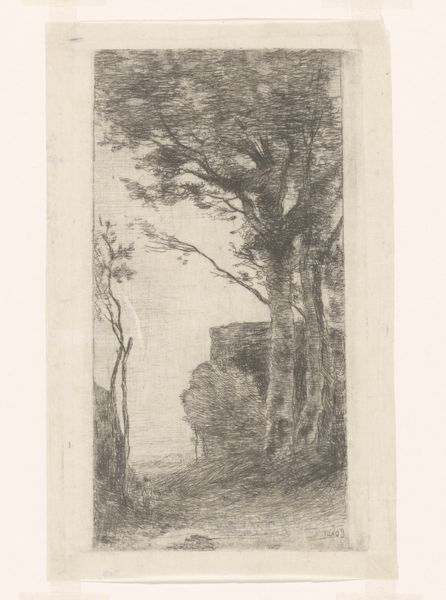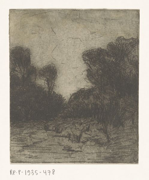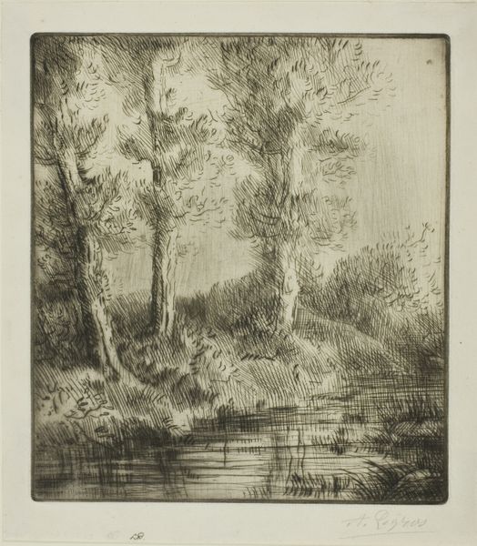 Curator: It feels like stepping into a hazy memory, doesn’t it? Sort of a dream-like landscape… Editor: Indeed. What you're experiencing is Thomas Moran's 1878 etching "Bridge and Trees". It presents a highly atmospheric, almost photographic, study of light and texture. Curator: It’s the density that gets me, the way everything, bridge, foliage, water, merges into this symphony of textures. Is that due to the medium? Editor: In part, yes. Etching allowed Moran a unique control over line and tone, enabling a build-up of incredible detail to capture that specific quality of light. Think about it: etching involves using acid to corrode the metal plate, allowing for very fine, controlled lines. It became extremely popular amongst realist artists, didn't it? Curator: He truly transforms the scene. You wouldn't guess what lies beyond this seemingly idyllic view. There's something about that subtle mist, a play between seen and unseen, that intrigues. It's as if he is exploring his emotions towards nature in his artwork. Editor: It is thought that this exploration and the adoption of techniques like etching reflect broader trends of the late 19th century. Museums and galleries were beginning to highlight printmaking, so an artwork such as this shows an integration within larger systems of taste, collecting, and display, not to mention marketing... Curator: Absolutely. Makes you wonder who owned it back then and where they put it. Something this lovely demands to be stared at from up close! Editor: It offers a unique insight into a particular time of aesthetic and cultural values, doesn't it? Curator: Absolutely, a fascinating conversation, even all these years later! Editor: A valuable reminder that art exists within networks far broader than the artist's studio alone.