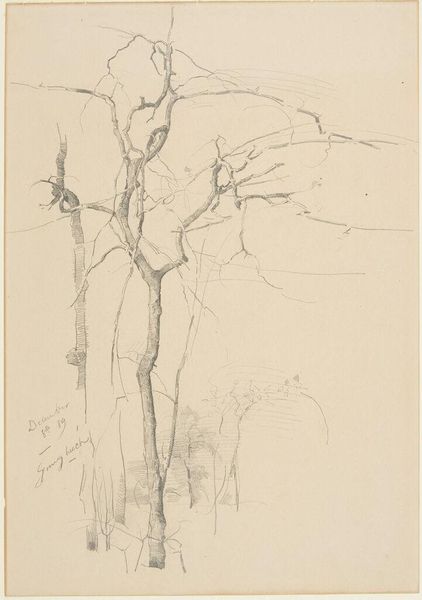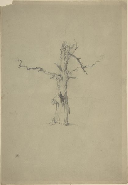 Editor: Here we have John Singer Sargent's "Study of a Tree," a pencil drawing residing at the Harvard Art Museums. There's a real sense of solitude in this spare depiction. What do you make of this quiet scene? Curator: Quiet indeed! It whispers of Sargent's more private explorations. Think of him escaping the clamor of portrait commissions, finding solace in the sinuous lines of that old tree. Notice how the light catches the branches? Editor: It’s almost like he's captured the tree’s very essence, not just its appearance. Curator: Exactly! Perhaps he saw a reflection of his own resilience in its gnarled form. What do you think Sargent was hoping to capture with this piece? Editor: I never thought of it that way, but that's a fascinating connection.