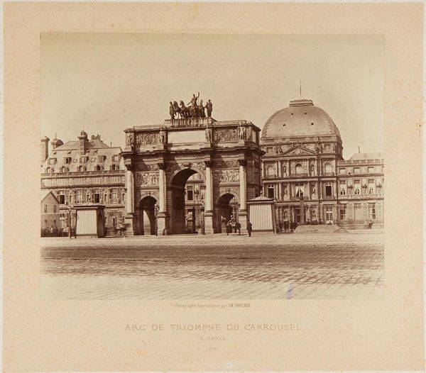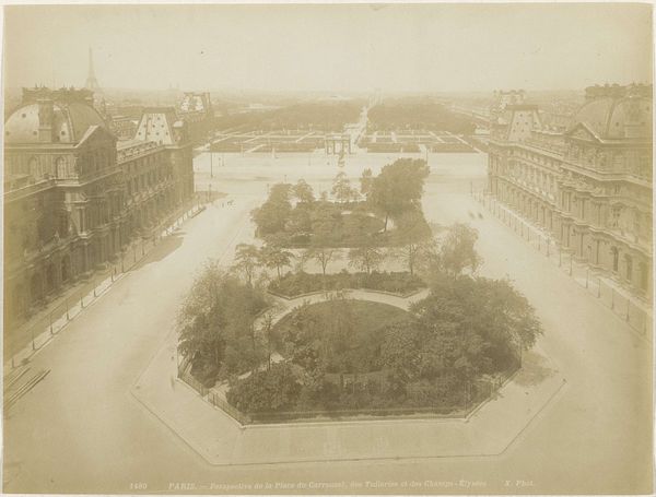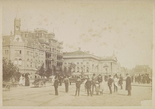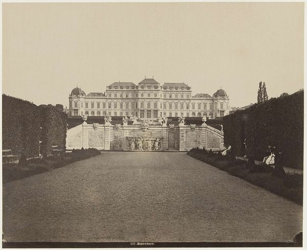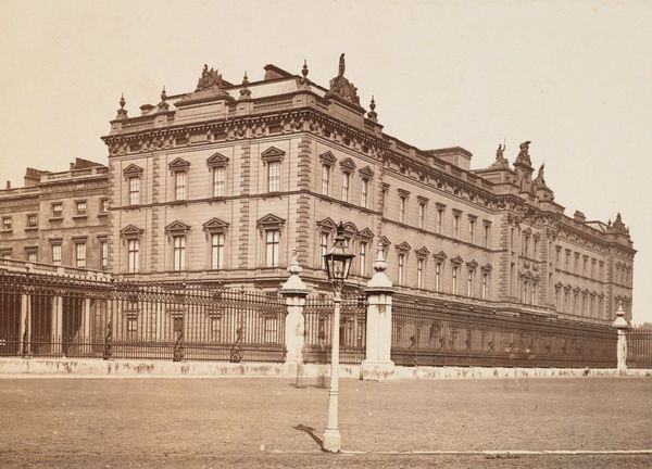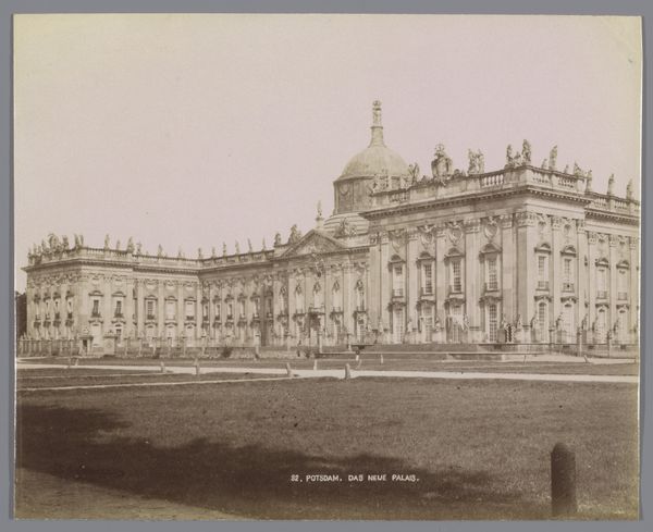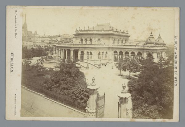 Editor: Here we have Johan Nöhring’s “Exterieur van de Oranjerie in Kassel,” an albumen print from sometime between 1870 and 1890. It's a fascinating depiction of neoclassical architecture. I am struck by the sharp focus on the Orangerie itself contrasting with the haziness of the unpaved ground in front. How might we consider this piece within a wider context? Curator: Let's examine the context of photography in that period. The albumen print was a relatively inexpensive process that facilitated the mass production of images. This specific image showcases not just the architectural achievements of Kassel but also the capabilities of industrial reproduction to reach a broad audience. Consider how the Orangerie, a symbol of aristocratic power and leisure, is rendered accessible through this readily available medium. The material conditions of photographic production are democratizing visual consumption. Editor: So, you're suggesting the image's significance extends beyond the Orangerie itself and into the realm of photographic production? How does the rise of photography shift artistic labor at the time? Curator: Exactly. We see the role of the artist transforming into one of image production, facilitated by advancements in chemical and mechanical processes. The labor involved shifts from the individual artistry of painting to the collective effort required for photography: from the photographer's expertise to the chemical production required in printing and processing. Think about how this image participates in the burgeoning tourism industry and promotes Kassel, offering us insights into social mobility and cultural consumption. Editor: I hadn’t thought about it that way, seeing it as part of the growing commercial industry. The focus shifts to the mechanics and implications of making images available to the masses. Curator: Precisely. By analyzing the materiality of this albumen print and its means of production, we unlock a deeper understanding of the social forces and transformations at play during this period. Editor: This really gives me a lot to think about regarding how art is both produced and consumed. Thank you for sharing your insights!