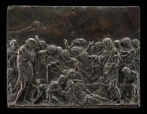 Curator: Andrea Briosco, better known as Riccio, crafted this bronze relief, "The Entombment." It's a scene teeming with emotion, capturing the moment Christ's body is laid to rest. Editor: It's intensely dramatic. The figures seem almost to spill out of the frame, their grief rendered in such physical, tangible forms. The bronze seems to almost vibrate with sorrow. Curator: Absolutely. Riccio, working during the Italian Renaissance, was deeply influenced by classical art. He often incorporated elements of ancient sculpture into his works. He was associated with the humanist circles of Padua, which focused their attention on man’s place in the universe, and the importance of secular leadership. Look closely at the detail in the musculature of Christ and the flowing drapery; there’s a real sense of theatricality. Editor: But that theatricality serves a powerful emotional purpose. It draws the viewer into the heart of this tragic moment. We're witnessing not just the death of Christ, but the collective anguish of his followers. What social structures and cultural mores are revealed by their exaggerated grief? Curator: In Renaissance society, art was a tool for reinforcing religious doctrine. These depictions of suffering served as potent reminders of the sacrifices made for salvation and it offered viewers ways of contemplating humanism in sacred stories. These highly expressive artworks, disseminated throughout society, reinforced specific narratives about authority and sacrifice. Editor: Yes, and it's important to remember the power dynamics inherent in such displays of suffering. Who gets to grieve? Whose pain is validated and whose is ignored? Looking at this through a contemporary lens, how does this artwork invite viewers to consider structures of grief? Curator: That’s a vital point. I would say, though, the remarkable artistry on display, from the composition to the subtle variations in relief, are what elevated Riccio among his contemporaries. His talent solidified his patron's standing. Editor: True, the craftsmanship is undeniable. And yet, I am compelled to reflect on the ways art, even masterpieces such as this, may participate in reinforcing historical imbalances of authority. Curator: Indeed. Contemplating this piece, with both its beauty and complicated social dimensions, challenges us to reevaluate our engagement with Renaissance artwork and its public significance. Editor: Agreed, the piece invites us to hold complexity: beauty and suffering, reverence and scrutiny. And perhaps in that tension, we can find new meaning.