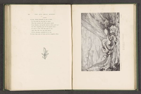 Artist: Oh, wow. What strikes me first is this peculiar stillness, almost like a dream captured in monochrome. The texture looks soft somehow, even though it's just an engraving. Curator: We're looking at a reproduction of a drawing whose title translates to, “Photographic reproduction of a drawing, representing Una's feet being licked by a lion." It's unsigned, but based on the stylistic qualities, the piece originates from before 1871. Artist: "Una's feet being licked by a lion"... sounds like a poem in itself! Look how delicately the lion's head is drawn, juxtaposed with the girl—Una, I presume—who's practically melting into the scene. Is she frightened or comforted, I wonder? Curator: The interaction itself has historical roots in tales of virtuous women protected by wild animals. Think of Romulus and Remus, and how similar themes often pop up when societies wish to express idealized purity and power dynamics, and the relationship with nature and its potential domination. Artist: Ah, power! It gives a new tint to that lick! It also makes me think about fairy tales… something primordial in our relationship with animals. Notice how small the character with the bow looks compared to the rest. Curator: Indeed. And bear in mind Romanticism often uses such contrasts of scale and posture to suggest individual vulnerability in the face of overwhelming emotional and natural forces. We need to question why a woman needs protection, or is seemingly subservient. Artist: True, but it's also undeniably sensual in its own way. The softness, the gentleness in the animal’s gesture… it makes you want to reach out and touch it. Do you think they realized they were creating something quite erotic at the time? Or was it all in the symbolic clothing? Curator: That is the central conundrum of decoding such iconography, isn’t it? Considering these elements allows us to grasp what lies between desire, idealized representations, and coded expressions from bygone eras. We are tasked to reveal these subtle undercurrents, whether intentional or unconsciously conveyed. Artist: Well, I can tell you for sure: intentional or not, as a fellow creator, I find these old artworks have a great deal to whisper to our contemporary sensibility. Curator: Precisely, a lens to comprehend complex interplays embedded within art history.
