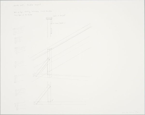 Curator: Mel Bochner, born in 1940, created this work, titled "Studies for Sackler Gallery Installation." It gives us a glimpse into the planning stages of an exhibition, all rendered with what looks like simple pen on paper. Editor: It feels intentionally sparse, almost cold. The stark lines and the emptiness of the gallery space evoke a sense of sterile precision, like a blueprint lacking human warmth. Curator: The sketch captures a liminal space—the moment before art meets the public. The arrangement of works, the labels scribbled onto the image... it shows the curator’s hand, a kind of ghostly presence. Editor: Exactly! The composition emphasizes the geometric structure of the gallery itself. The rectangles and lines create a grid that both contains and highlights the potential art. Curator: I see this as a commentary on institutional display, stripping away the grandeur to reveal the bare bones of presentation, the power dynamics inherent in exhibition-making. Editor: It also serves as a fascinating study in visual anticipation, creating tension between absence and presence. We project our own expectations and interpretations onto these empty spaces. Curator: Indeed, Bochner’s preparatory drawing becomes a meditation on the exhibition space itself. Editor: Yes, it shows a gallery that has all the elements in place and yet is pregnant with promise.
