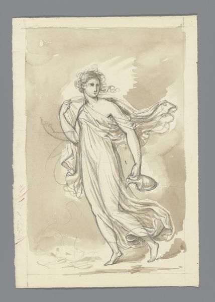 Eduard von Heuss made this watercolour titled ‘Lopende jonge vrouw’ or Running Young Woman in colourfully, fluttering robe, against a dark background’ sometime in the 19th century. Notice how the artist uses light and dark washes to create a sense of movement and depth. The contrast between the dark background and the light robe of the woman makes her figure stand out, whilst the loose brushstrokes suggest the movement of both the figure and the fabric. The washes are applied in such a way as to be representational, but not naturalistic; the colour and flowing lines have an expressive effect. The semiotic system at work is not one of mimetic representation, but of symbolic expression. The colours, the dynamic brushstrokes and the ethereal form all work together to evoke a sense of lightness and freedom. This work is a study in how form and colour can suggest emotion and movement.