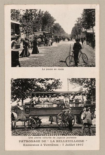 Editor: This is a photograph from 1907, titled "Industrial Problems, Coöperation: Europe. France. Paris." It's by Edouard Cordonnier. It shows a holiday excursion. It feels like a glimpse into a different world. What captures your attention in this image? Curator: The power of collective joy, paradoxically. Look at the sea of hats in the top frame— a uniform, almost militant aesthetic, juxtaposed against the carefree abandon of a holiday outing. It whispers of socialism's promise, doesn't it? Editor: Definitely! I see what you mean. Curator: I’m tickled by the literal “voiture de la Symphonie” – talk about bringing music to the masses! What do you make of the children in the top photograph? Editor: It's like they're the future of this cooperative spirit, bright-eyed and full of hope. It's a sweet contrast. Curator: Exactly! This makes me think, how do we capture community now? Maybe we need our own "voiture de la Symphonie." Editor: That would be something! It's amazing how a single image can spark so many thoughts.