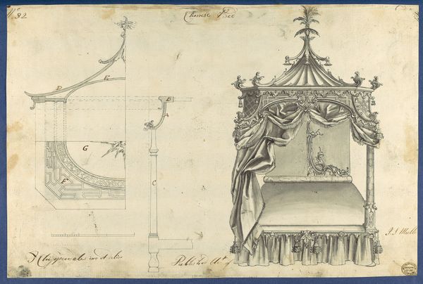 Curator: Thomas Chippendale's "Gothick Bed, in Chippendale Drawings, Vol. I," created in 1754, offers us a fascinating glimpse into the design aesthetics of the period, a period wrestling with notions of taste and identity in a rapidly changing world. It's a drawing, or rather a print, showcasing a proposed bed design. Editor: The initial impression is overwhelmingly ornate, wouldn't you agree? A theatrical kind of sensibility. The lines are quite elegant, especially in the canopy’s decorative elements, but overall, the structure appears very… heavy. Curator: Indeed. But the apparent weightiness speaks volumes. This wasn’t simply about creating a functional bed; it was about projecting power and status. "Gothick" wasn't about accurate historical revivalism; it was a fantasy, an embrace of perceived grandeur that allowed wealthy patrons to align themselves with romanticized notions of lineage. These kinds of displays of wealth were highly controversial though: they can be contextualized with rising socio-economic disparity in mid-18th century England. Editor: The semiotic play is evident even now. The pointed arches and elaborate tracery on the canopy borrow vaguely from Gothic cathedrals, but rendered here in a light, almost whimsical manner. Look at the curves of the headboard as well: it contrasts sharply with the rigid geometry on the side. What's that? Blueprints perhaps? Curator: Exactly! You've astutely identified an important contrast in presentation! That’s the brilliance of presenting this kind of ornamental piece next to structural schematics. The visual interplay between those elements adds an intellectual layer, signaling not just wealth but an understanding, perhaps even a mastery, of design principles. Editor: It highlights the intersection of artistry and construction; of pure aesthetics with the precision of calculated form. These line drawings convey dimension in just one color: light. It also appears the work exists on just one plane, enhancing its formal appeal, and flattening perspective to great visual effect. Curator: Precisely, this piece enables us to really examine the period’s understanding of itself through material culture. Its design and even its medium tell the tale of both aspiration and exploitation. Editor: Reflecting on this drawing, I see an attempt to synthesize diverse aesthetic impulses under a unifying design, for better or for worse. Curator: Agreed. Chippendale provides such fertile ground for unpacking the complex and often contradictory social and aesthetic values of his era.