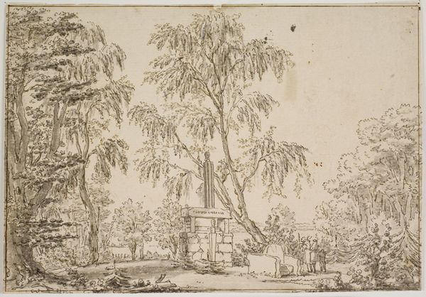 Frans Boudewijns' Italian landscape with a ruined fountain, rendered in sanguine, compels us with its intricate lines and serene decay. The composition is structured around the dilapidated fountain, which serves as a focal point amidst the surrounding nature. Boudewijns masterfully employs line to create depth and texture. Look at the way the cross-hatching suggests shadows and the gentle gradations of tone, giving life to the stonework and foliage. The careful rendering of the fountain’s cracks and crumbling edges introduces a dialogue between the eternal and the ephemeral. Semiotically, the ruin can be seen as a signifier of mortality, challenging fixed notions of permanence and reflecting a broader philosophical concern with the transience of human achievement. Notice how the choice of sanguine ink warms the scene, yet simultaneously underscores the melancholic undertones of decay. The formal elegance with which Boudewijns captures this ruin transforms it into a powerful meditation on time, memory, and the poetics of decline.