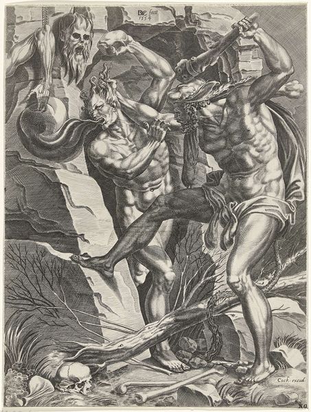 Nicolaes van Geelkercken made this print, "Two Germanic Warriors, Figure III", sometime in the early to mid-17th century. It presents a classical vision of ancient Germania, a land which the Dutch, then fighting for independence from Spain, identified with their own struggle for freedom. This image creates meaning through visual codes: the figures, while meant to appear barbaric, also have a classical muscularity, reminiscent of ancient Greek or Roman sculptures. The attire, or lack thereof, seems designed to appeal to a cultured, educated audience familiar with classical imagery and a northern European interest in the “noble savage.” The Rijksmuseum collection database and other historical sources provide further insights into the meanings that the image had at the time. Ultimately, the interpretation of art is contingent on social and institutional context and on understanding the conditions of its production.
