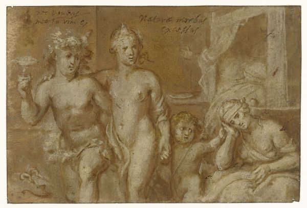 Curator: This is "Adam Accepting the Apple from Eve," believed to have been created around the 17th century. It's currently held at the Minneapolis Institute of Art. What strikes you first about this composition? Editor: It’s somber. Almost monochromatic, relying heavily on shadow to create a sense of drama, even guilt, perhaps? You immediately notice the tangible quality of the figures formed by what appears to be brown oil-paint and charcoal. Curator: Absolutely. Considering it portrays the moment of the Fall, that subdued palette contributes powerfully to its narrative weight. The historical context frames this as a pivotal point of choice and consequence. It makes me think about how women, and Eve specifically, have been positioned through these types of images. Editor: The application of materials seems central to this discussion; note the visible brushstrokes, the blending of oil and charcoal. These choices were certainly deliberate. One may argue that they create the mood you spoke of—but I suggest that these choices could equally signal an exercise of labor intended for a patron. Curator: That’s interesting – labor being central to the patronage and perhaps to our understanding of this creation of a biblical scene. Consider the way the bodies are rendered, their positioning relative to each other. The apple is a symbolic item here; power, knowledge, and rebellion intersect. How might intersectional power dynamics manifest in this art work’s cultural interpretation and historical consumption? Editor: Yes! This intersection suggests a deeper look into how the material making informs the interpretation. How was charcoal sourced? The paint mixture of oil created? This tells us something about access and the social context within which these pieces come together. Curator: So, as we stand before this rendering of temptation and downfall, both the symbolic weight carried through centuries of interpretation and the tangible evidence of its creation using brushstroke and blending remind us that art offers a complex lens for seeing the historical representation of power, choice and creation itself. Editor: Indeed. We've delved into how artistic expression can reveal profound insights. Through this interaction with historical narratives and the materials used to create these visuals, it helps contextualize both subject and production.