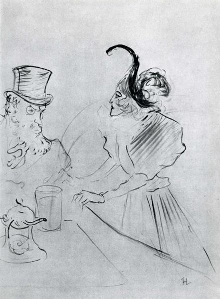 Editor: This is "Black Coffee" by Aubrey Beardsley, a drawing residing at the Harvard Art Museums. The angular lines and stark contrast give it such a distinctive, almost unsettling feel. How do you interpret this work? Curator: Notice how Beardsley employs caricature, exaggerating features to convey something beyond the surface. The woman on the left, do you see a hint of horns in her elaborate hairstyle? Editor: Yes, I do! Almost devilish. Curator: Precisely! Coffee, then, could be a symbol of decadent pleasure, an indulgence with potentially dark consequences. The image lingers in our minds, stirring complex associations, don't you think? Editor: It certainly does. Seeing those symbolic touches really changes how I view the artwork.