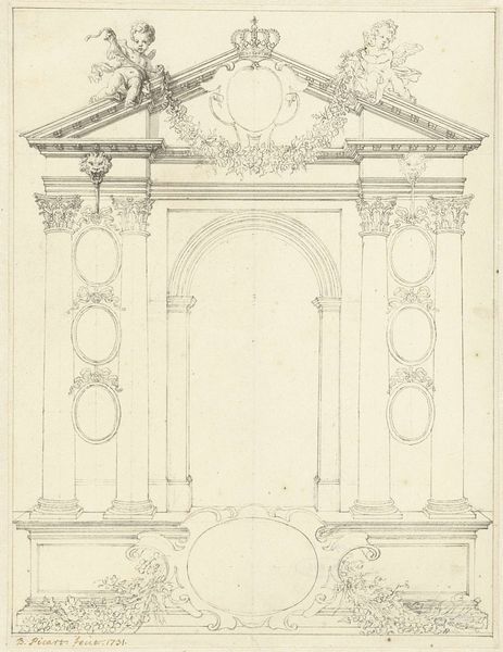 This is an ink drawing of a chapel doorway, by an anonymous artist. Though we don’t know who made it, this design offers a glimpse into the artistic and religious practices of its time. The architectural style, with its symmetrical structure and classical columns, reflects a specific aesthetic. The doorway, with its imposing presence, suggests a place of transition, inviting the faithful into a sacred space. The coat of arms, prominently displayed, symbolizes power, lineage, and perhaps even the specific religious order the chapel was dedicated to. Consider how the design emphasizes the hierarchical nature of religious institutions. How might the experience of entering this space been perceived by different members of society? This drawing serves as a powerful reminder of the intersection between art, faith, and social identity.