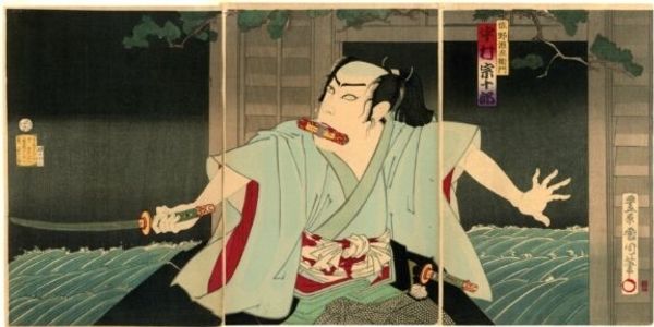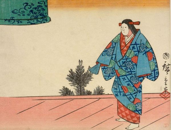 Editor: Here we have a woodblock print by Katsushika Hokusai, depicting the actor Sawamura Sōjūrō. There’s a quiet intensity about him, almost melancholic. How do you interpret this work? Curator: It whispers of the floating world, doesn’t it? Hokusai captures the actor's inner life, not just the costume. Notice how the lines both define and dissolve the figure – a tension reflecting the ephemeral nature of performance itself. Does it make you think about the mask we all wear? Editor: It does now! It's fascinating how much emotion he conveys with such simple lines and colours. Thanks! Curator: The pleasure is all mine! Now you see why Hokusai is such a legend.