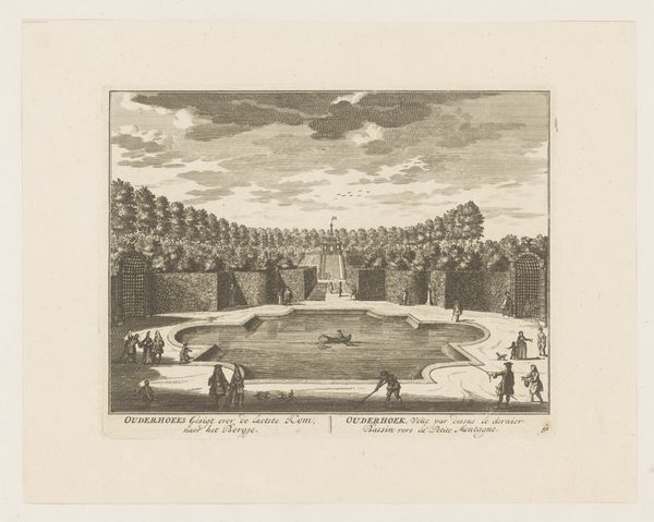 Editor: This is "Gezicht vanuit huis Wallestein richting tuin," a 1719 etching by Daniël Stopendaal, housed in the Rijksmuseum. It feels so ordered, so perfectly arranged, a glimpse into a very controlled world. What story do you think it’s trying to tell? Curator: More than a story, it presents a worldview. Look at the formal gardens: their rigid geometry speaks to a desire for control, mirroring the power structures of the time. Who gets access to such carefully manicured space, and who is excluded? What does that exclusivity communicate? Editor: So the garden isn’t just a pleasant place, it's a symbol? Curator: Precisely. Landscapes like this, carefully cultivated and visually recorded, reinforced societal hierarchies. The print itself serves a purpose: disseminating the image of wealth and status. Consider also the activity depicted; observe how leisure, status, and freedom were portrayed for a select few. Where is labor represented here, if at all? Editor: I hadn't really thought about it that way. It’s like the image is actively working to promote a certain idea of society. Curator: Exactly. Etchings like this were often commissioned by or for the elite, acting as both records and tools for solidifying their position. Do you notice anything about how different figures interact, or don't interact, within the frame? Editor: Now that you mention it, everyone seems very self-contained. There’s not much sense of community. Curator: That’s insightful. Even in leisure, social strata are subtly reinforced. Reflecting on this image reminds us that art isn’t passive; it's engaged in complex dialogues with power and identity. Editor: This has totally changed how I see landscapes from this era! Thanks so much for sharing your perspective.