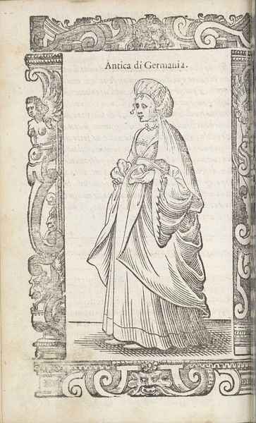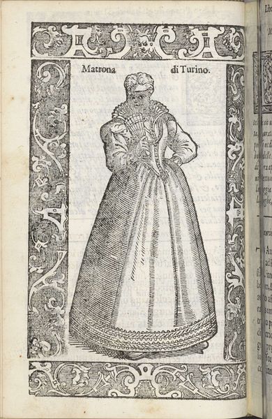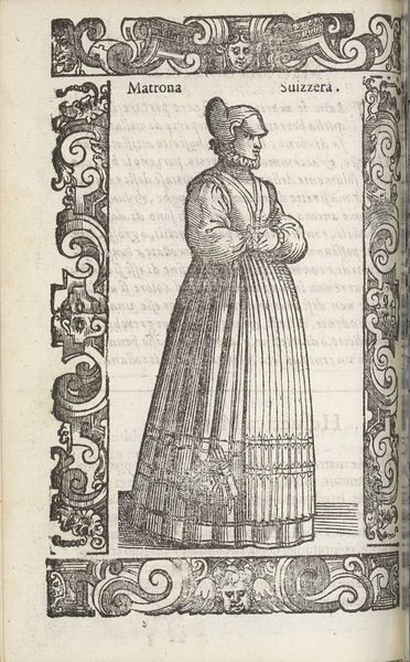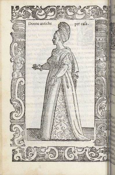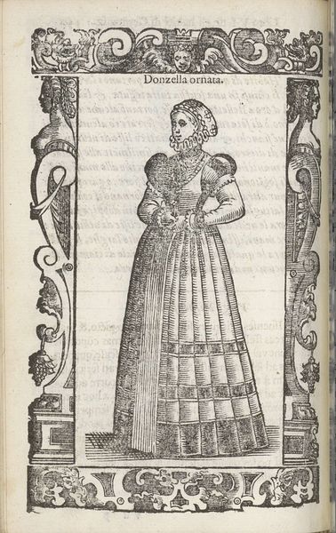 Editor: Here we have "Antiche di cent’anni" by Christoph Krieger, an engraving from 1598. I'm struck by how the woman's dress, rendered with such intricate lines, completely dominates the composition. What can you tell me about its historical context? Curator: Well, this engraving reflects a period of fascination with history, especially within courtly circles. Krieger's choice to depict what is explicitly described as "old" styles is significant. It speaks to an engagement with the past, but more importantly, to how elite fashion was used to convey power and prestige. Notice how the framing emphasizes the artifice, literally placing her within a constructed past. Editor: So, it's not necessarily about historical accuracy, but more about using history to make a statement? Curator: Exactly. These "ancient" fashions become tools for constructing identity. Think about who would have commissioned or viewed this print. The act of acquiring knowledge and displays of "historical" styles affirmed their status and knowledge, placing them within a continuum of cultural legacy. What do you make of the starkness of the lines, the almost diagrammatic quality of the image? Editor: It's like it's trying to archive or codify something... almost like an early fashion plate! Curator: Precisely! This print exists at the intersection of art, social commentary, and early forms of visual record-keeping. These are "centuries-old" clothes displayed at a remove; not simply replicated for posterity, but transformed into commodities through a very specific social lens. Editor: I hadn’t considered how deeply enmeshed art and social status were at that time. That perspective really transforms how I see the work. Curator: It is always interesting to investigate what function this artwork had at the moment and within which socio-economic forces it became an artwork and part of our visual culture.