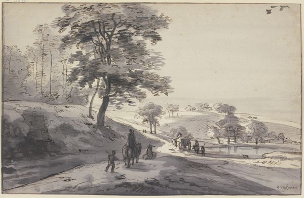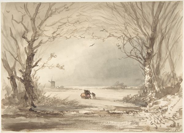 Curator: We’re looking at “Winterlandschap met hooislee en schaatsers” by Andreas Schelfhout, a work dating somewhere between 1797 and 1870. It’s rendered in watercolor and pencil. Editor: It's strikingly bleak, isn’t it? A washed-out scene. The palette is so limited, all grays and browns, which emphasizes the starkness of winter. It's as if the color itself has been frozen away. Curator: Schelfhout excelled at capturing Dutch winter scenes. The genre was quite popular, really taking off in the 17th century as a symbol of Dutch resilience and ingenuity in the face of harsh weather. There is a historical context to viewing and representing this image, which is beyond the obvious romantic reading of snow. Editor: I see that historical context at play even in the placement of figures. People seem to be grouped carrying firewood or bundles and traveling as needed, each interaction subtly underscores the community and the social demands for warmth. And a distant windmill? The symbol is working but under dim daylight and difficult sky. Curator: Definitely. And while seemingly simple, it's technically skillful. Notice the almost photorealistic details rendered with pencil, like the texture of the thatched roof or the bare branches of the trees. He understood how to harness the symbolic resonance of landscape to evoke a sense of place. The sky alone appears foreboding as a veil covering a hidden world. Editor: It also seems to comment on class dynamics. Notice those who have gathered and struggle in the winter’s cold versus those with private housing, more isolated but also more capable to endure and dominate this season. It subtly visualizes disparities in the access to power as defined by comfort. Curator: Precisely. Beyond the aesthetic pleasure of a winter scene, this landscape painting reflects a specific cultural narrative. It underscores social endurance and collective history through visible icons, a kind of communal portrait. Editor: I agree. I went in expecting bleakness and romanticizing, and came away considering how even a winter landscape serves as a sociopolitical document of resilience. Curator: Indeed. It reminds us that even seemingly straightforward images are embedded within complex networks of cultural meaning and social discourse.