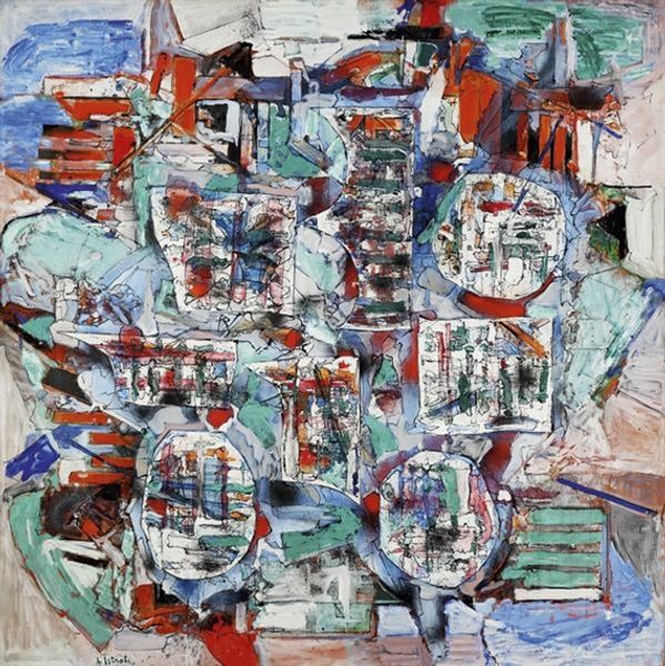 Alexandre Istrati made this "Composition" with some kind of paint; oil, acrylic, I can't be sure. But he was clearly led by the material, and seems to have relished the hands-on aspect of artmaking. The surface is busy, almost agitated, with broad areas of colour intermingling with smaller more worked passages. There’s a tension between the intuitive and the calculated. The yellow bars look flat like they've been collaged onto the picture surface. But the textures throughout the rest of the painting are so tactile, with different paint handling techniques employed to create both depth and a sense of movement. Look at the bottom left, there's a passage of darker paint, greens and browns, with thin black lines scratched into the surface. This feels like a very deliberate act, a moment of control within the broader chaos of the image. In a way, I'm reminded of Guston's late work: the boldness of colour, and the playful sense of the absurd. But Istrati's painting is very much its own thing, an interesting statement in the ongoing dialogue of abstract painting.