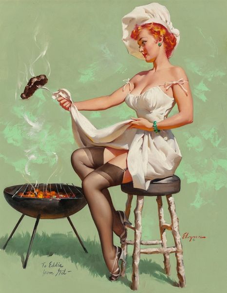 Curator: Danny Galieote's painting, "I Think It's Ready Dear," presents a puzzling tableau rendered in oil paint. What’s your initial reading? Editor: An immediate sense of…unease. There’s a carefully constructed, almost Stepford Wives aesthetic, juxtaposed with something deeply unsettling lurking in that oven. The scale and texture of the octopus are viscerally jarring, especially against the tidy kitchen. Curator: The artist deliberately clashes those elements. Look at the composition: the cool tones of the vintage appliances, the woman’s outfit—the whole scene echoes mid-20th century domesticity. Editor: But that idealized image crumbles under scrutiny. What's with that Boston Red Sox advertisement, given their abysmal mid-century history? Is the reference to the "Home Sweet Home" sign purely ironic? This resonates with contemporary feminist critiques of gender roles—the claustrophobia of domestic expectations made monstrously literal. Curator: Perhaps, but consider the formal properties too. The high level of realism, the attention to detail in the rendering of textures – from the glazed lobster on the counter to the slimy octopus. There’s a clear intent to portray a believable space, however surreal its contents. The warm red background really pushes that octopus forward. Editor: And isn't the act of portraying a woman cheerfully tending to this… culinary nightmare itself a statement? The artist isn’t just showcasing technique; they’re making a comment on the societal pressures women face to effortlessly manage even the most absurd demands. What are those carrot garnishings even doing in the oven alongside an octopus?! Curator: Precisely. It’s about challenging pictorial space, upsetting our expectations of subject matter. Galieote's work here utilizes an interesting subversion of the "still life" and "genre painting" conventions to achieve an unsettling visual and perhaps semantic outcome. Editor: Ultimately, "I Think It's Ready Dear" stays with you. It's a vibrant, beautifully executed, but also deeply disturbing, exploration of femininity and social expectation that is delivered with a heavy dose of irony and sarcasm. Curator: A challenging painting, both formally compelling and conceptually rich.