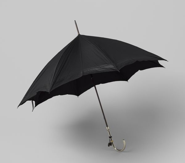 Curator: Look at this! We have a charming photograph from around 1900. The title is quite descriptive: "Parasol met dek van effen wit katoen, op een lichte houten stok, waaraan een haak van hoorn." Plainly, "Parasol with a cover of plain white cotton, on a light wooden stick, with a horn hook." The Rijksmuseum is the keeper of this one! Editor: Instantly, I think of innocence, even naiveté. That stark white against the simple wooden frame... It's so clean, so utterly devoid of any ornament beyond its functionality. It speaks to a certain type of protected, almost sheltered existence. Curator: You know, white always does evoke those feelings of purity, doesn’t it? Cotton, especially back then, implied a kind of refined simplicity. It’s interesting how even everyday objects were so carefully crafted. That horn hook—such a small detail, but adding a subtle touch of sophistication. What do you read into the choice of material? Editor: The cotton itself tells a story. Think of the Empire dress, or the Gibson Girl: silhouettes constructed within the language of this white. It suggests the careful distance kept from anything deemed ‘unclean’. And in iconography, the parasol speaks to ideas about female presentation—it's both shield and display. Keeping pale skin as status, for instance, as it shields you from laboring in the sun. But it makes me wonder… Who did this belong to? What was her story? Curator: It does spark questions, doesn’t it? Schnitzler managed to transform a mere object into a vessel for history and feeling. He understood what a powerful signifier something as commonplace as an umbrella could become. It is that power, when put into photographic rendering, that can so captivate the modern viewer. Editor: Exactly. Objects absorb history, emotion, like a sponge. It reminds us of the layers of meaning in even the most ordinary items, like the secrets they whisper if we take the time to really see. We have to think what is considered feminine during this era; these images speak back to us. Curator: Well, next time I'm caught in a downpour, I’ll certainly look at my own umbrella with a new level of respect! Editor: And I’ll be imagining a procession of parasols, shielding faces from sun and society! A beautiful testament to how things carry meaning!