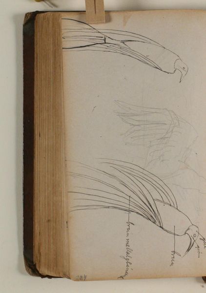 Curator: Welcome. Here we have "To studier af paradisfugl" – or "Two Studies of Bird of Paradise" created sometime between 1864 and 1941, by Niels Larsen Stevns. It's a sketch done in ink and possibly colored pencil on paper, currently held here at the SMK, Statens Museum for Kunst. Editor: Well, the first thing that strikes me is the quiet elegance, almost austere. These line drawings, so precise, so economic, somehow capture more than a fully rendered color study could. The blankness of the paper contributes a stark sense of space. Curator: Stevns, ever the poet of the ordinary, elevates these birds into objects of careful contemplation. You feel him, in each stroke, attempting to truly *see* them, beyond mere ornithological observation. It's almost as if he’s attempting to draw their essence. Editor: Indeed. The lines aren't just descriptive; they're evocative. See how the lower bird, emerging from its blossom, hints at a kind of semiotic closure, a formal condensation between natural propagation and the artistic rendering? Curator: I love that you describe it that way! It also touches something primal in me, that human need to capture the fleeting beauty of life through art. You imagine him watching the birds in the garden, compelled to put down what he saw and felt. Editor: And those simple lines become traces of a shared experience across time. Also, the economy of Stevns lines is something interesting for discussion – if he would put any other lines in these shapes the drawing is not that deep or catching – I guess? Curator: Absolutely. What seems minimal contains an incredible richness when one looks deeper into the form, don't you agree? Editor: Indeed, and in that richness of forms, the void that surrounds these forms speaks – the negative spaces activate other aspects of form perception to generate deeper content that makes it fascinating from a semiotic approach, it is hard not to stare at this drawing from a close look. Curator: A sketch isn't just a prelude; it's often the purest distillation of an artist’s vision. Thank you for these insightful approaches, it enriched the work greatly in my eyes.