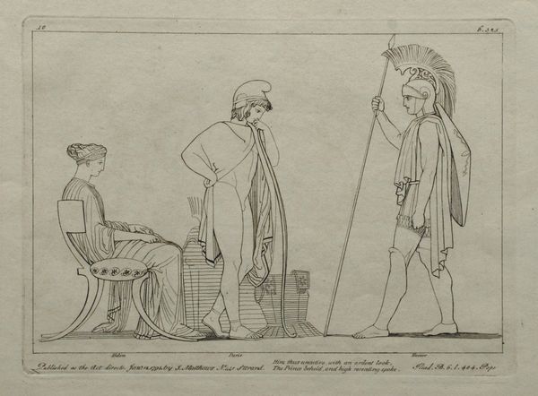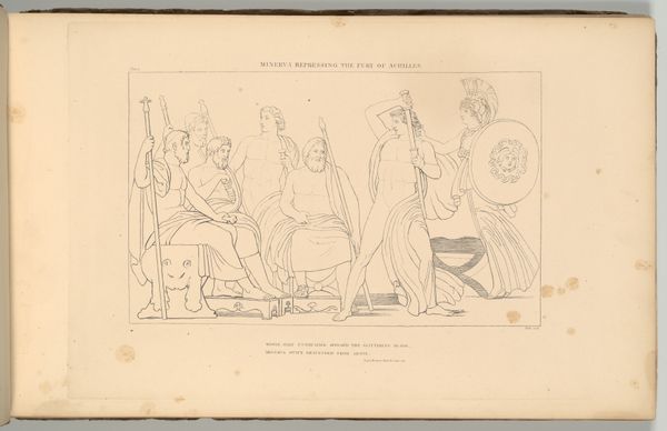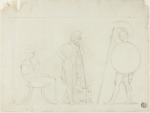 Curator: Here we have John Flaxman's drawing "Achilles and Patroclus." Undated, it presents a scene rendered in ink on paper. What strikes you first? Editor: The quietness. The stillness is almost haunting. It’s all so minimal, so refined… like a memory etched in pale ink. There’s such melancholy. Curator: Minimal is apt. Flaxman, steeped in Neoclassical ideals, simplifies the forms down to their essence. The line becomes the primary vehicle for conveying narrative and emotion. It seems he sought to purify design and elevate it from superfluous decoration, emphasizing linear contours. Think of pottery production with designs added using similar graphic restraint, an emerging consumer good. Editor: Absolutely, the lines are doing a lot of work here. There is the spare depiction of Achilles, head bent, almost lost in his music. It contrasts starkly with the weighty, symbolic armour standing guard beside him. You get the impression of stifled energy. Curator: Note how the composition emphasizes restraint. Each figure, framed by a simple chair, occupies distinct spaces. Their separation reinforces a narrative of suppressed passions. We see a tension that's not merely emotional, but reflective of the burgeoning industrial systems of labour within Flaxman’s period, as well as aesthetic disputes around high and low art distinctions, all emerging concurrently. Editor: Yes, their connection feels… contained, mediated. I keep coming back to the lyre. It’s not just an instrument; it's a conduit for the unspeakable. A barrier and a bridge. The image suggests the suppression that rigid societal structures place on intimacy between men. It reminds me of long ago… feelings I wasn't allowed to show. Curator: Flaxman was deeply influenced by the social reform movements of his time, advocating for the integration of art with industrial production, as well as challenging hierarchies in academic art instruction. "Achilles and Patroclus" speaks of emotional restrictions and how this print aesthetic became embedded in commodity culture. Editor: I suppose that blend is why this still speaks so clearly across time. To me, the raw pain, thinly veiled, really comes through. Curator: Ultimately, Flaxman’s drawing is more than a story of legendary heroes; it's an observation of its social fabric that holds a continued emotional and intellectual resonance. Editor: Yes, it is a delicate reminder of the tensions that still vibrate just below the surface of modern life.