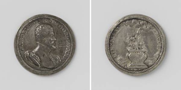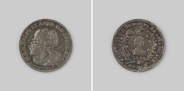 Editor: Here we have "Fifth Birthday of Princess Carolina", an engraving in metal created by Martin Holtzhey in 1748. It seems so formal, almost like peering into another world. I’m curious about the choice of such a seemingly permanent medium for something so ephemeral as a child’s birthday. What strikes you about it? Curator: Oh, ephemeral, you say? But isn't that the very charm? Consider: metal immortalizing fleeting moments. Holtzhey captures the essence of a Baroque fascination with commemoration, transforming something deeply personal into public artifact. Look at the two sides - the princely couple, then Carolina herself, framed by triumphant laurel. Isn't that ambition ringing loud? Does this resonate with a desire to elevate a royal image, and perhaps an entire dynasty? Editor: It does, actually, now that you point it out. The laurel feels less about Carolina specifically, and more about what she represents for the family’s image. Curator: Exactly! Holtzhey isn't just making a coin; he's casting a future. What do you suppose the intended audience felt seeing this coin, possessing this... this miniature monument? Pride? Hope? Did they jingle in their pockets with a different ring than the other currency of the day? Editor: Probably, it is also meant for people to remember her future as well. It’s really clever how this everyday item transforms into propaganda when you think about it that way. Curator: Propaganda, yes! But softened, if you allow, by sentimentality. What a recipe, eh? I do love how a simple engraving opens up windows into forgotten ideologies. Editor: Me too! I’ll definitely think about Baroque art a bit differently after this. Curator: Fantastic! Always keep your pocket change close and your heart even closer. One never knows where those tiny worlds will lead you.