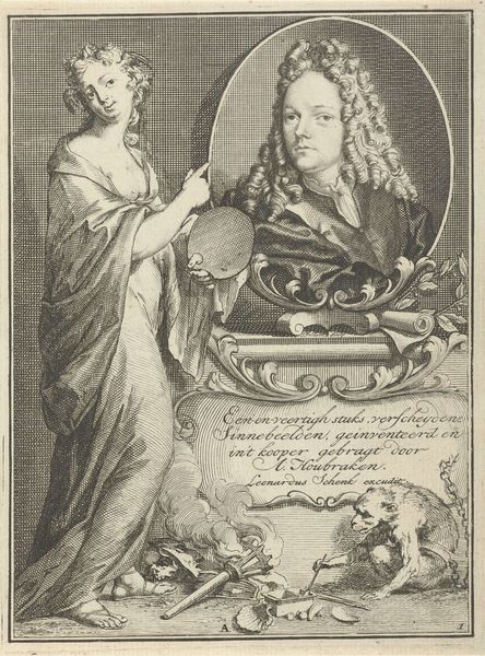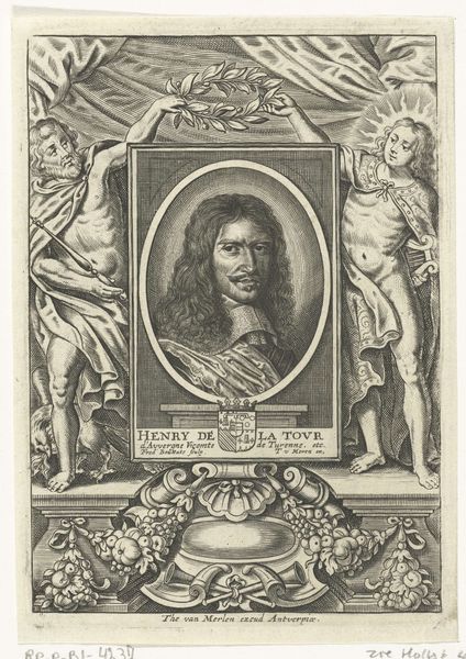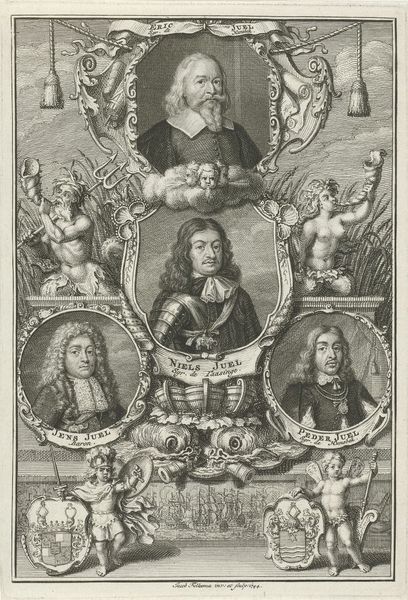 This is Pieter Sluyter's title page for the "Europische Mercurius," created in 1705. This Dutch periodical, translating roughly to the "European Mercury," was a politically engaged magazine aimed at literate, upper-class men in the Netherlands. The image is packed with allegorical figures: a portrait of William III of Orange sits within a laurel wreath. He is flanked by female figures who represent virtues, while putti struggle to hold up the central image. The masculine, muscular figures at the base represent rivers. Sluyter cleverly uses classical references to frame contemporary politics. The "Europische Mercurius" sought to shape public opinion and legitimize the ruling class. Through art, these periodicals presented a vision of Dutch identity intertwined with power, trade, and a specific social order. Sluyter’s image offers a glimpse into the visual strategies employed to disseminate information and reinforce cultural values in the early 18th century. What does it mean to have access to, or be excluded from, the shaping of public opinion?