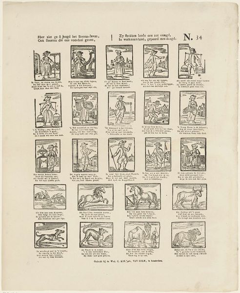 Curator: Here we have an engraving from between 1761 and 1804, currently held at the Rijksmuseum. The long title reads, "Here is the youth sketched the months of the year, / As each of these gives us details, / That are worth knowing; if it pleases, see there / To each given for entertainment, with use and reason.” Editor: It’s surprisingly busy. Each month depicted in these tiny compartments feels like a concentrated burst of everyday life. Is that even possible? The print uses simple line work, yet still provides very evocative images that capture the essence of each scene. Curator: The composition presents a structured, almost grid-like arrangement of these twelve scenes. Each vignette is neatly framed, creating a sense of order and categorization typical of Dutch Golden Age prints, but it seems very busy. There is symmetry through the frame elements that add some sense of order. Editor: But it is fascinating how much information can be conveyed. The artist is exploring the human experience through these symbols – from labor to leisure, each panel triggers our understanding of how those moments, and especially their associations, resonate today. For example, you see in this one what appears to be butchering that symbolizes harvesting the bounty and preparing for winter months ahead. Curator: Structurally, the linear qualities are quite compelling. The engravings’ reliance on stark contrast between light and shadow emphasizes each discrete frame. Look how effectively the artist employs simple lines to define the architecture and landscape, highlighting the materiality through skillful marks. Editor: Each month's depiction works like a microcosm that is intended to shape behavior. They serve as a historical document reflecting agricultural and societal conventions of the era while carrying a symbolic, cultural significance. Curator: Considering that, this work shows how artistic skill could function practically within society through instruction, while being driven primarily through aesthetic choice. Editor: Absolutely! We see the echoes of cultural narratives, shaped through symbols and sustained over centuries. It’s a real treat to dive deep and discover layers that remain relevant even now.