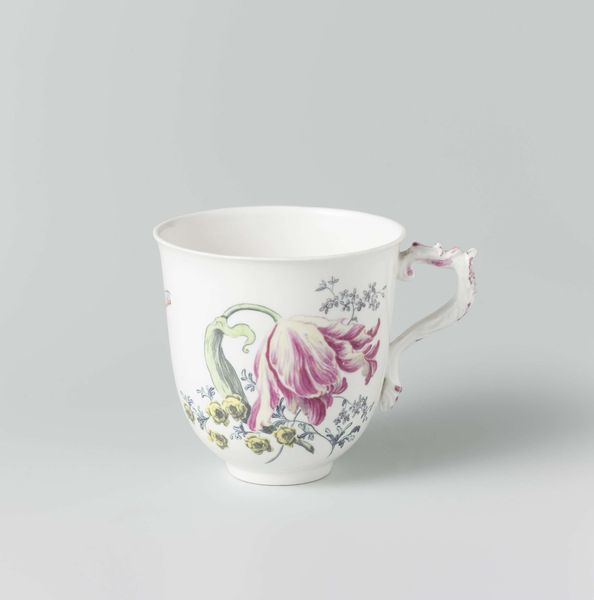 This is a porcelain cup, painted with decorative bands and floral garlands, made in Loosdrecht, likely in the late 18th century. The cup's delicate form and painted decoration speak to the fashion for fine porcelain that swept through Europe at this time. Loosdrecht was home to one of the earliest Dutch porcelain factories, established to compete with the dominance of Meissen and Sèvres. The floral motifs and refined aesthetic reflect the influence of French Rococo, a style embraced by the European elite. Porcelain cups like these were luxury items, symbols of status displayed and used in fashionable tea ceremonies. Understanding this cup requires considering the economic and social conditions of the time, researching the history of the Loosdrecht factory, and studying the dissemination of artistic styles across Europe through the trade of luxury goods. Appreciating this artwork lies in recognizing its place within a complex web of social, economic, and artistic exchanges.