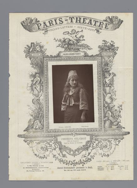 Editor: Here we have a photograph, taken by Alfredo Noack between 1870 and 1895. It depicts a mosaic of Christopher Columbus in the Palazzo Tursi, Genoa. I'm immediately struck by the framing; it’s so ornate! What catches your eye, and how do you approach a work like this? Curator: Formally, the nested frames construct a visual hierarchy. The central oval isolates Columbus, rendering him a figure of prominence. Then the secondary frame adds visual complexity and serves to emphasize the overall presentation of the portrait. The symmetry, moreover, contributes to a sense of balance and order. What do you make of the use of monochrome, given its photographic nature? Editor: It almost feels like it's trying to evoke a classical sculpture or engraving, despite being a photograph of a mosaic. Perhaps aiming for timelessness? Curator: Precisely. The grayscale palette negates potential distractions of colour, instead directing the eye to form and texture. Observe how light plays across Columbus’s garments, creating tonal variations that define volume. Are we, thus, seeing a purely representational image, or is there something more at play here? Editor: I think the framing turns this photograph of a mosaic into an artifact in itself, it changes our understanding of its function. The coat of arms at the top is intriguing, also. Curator: It recontextualizes Columbus as a symbol, embedded in Genoese history. The mosaic medium and the photographic rendering both become integral parts of the meaning. One refers to its source, and the other speaks of that source in translation through time. Editor: I never thought about how the medium and its treatment affects how we see a photograph like this. Curator: Paying attention to these formal elements reveals a complexity beneath what at first appears to be simply a portrait.