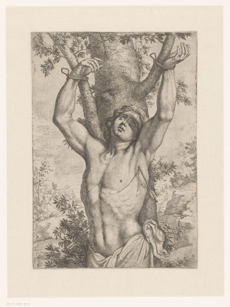 Curator: This engraving, “Half-Naked Man with His Hands Bound to a Tree,” was created in 1761 by Carl Friedrich Holtzmann. Editor: It’s… bleak. There’s an immediate sense of vulnerability. The lone figure tied to a bare tree evokes captivity, maybe even sacrifice. The raw exposure and the desolate background amplify that feeling. Curator: Precisely. Consider the visual language – the Baroque era, with its penchant for drama and intense emotion. The binding acts as a metaphor for restraint, powerlessness. Given the period’s complex power dynamics, it invites analysis through postcolonial and critical race theory. Editor: Absolutely. The figure is vulnerable but his gaze meets our own. There’s an assertion there too. I'm particularly struck by the rope binding his hands - a repeated visual motif throughout history. Chains of enslavement but also bonds of spiritual obligation or destiny. Does Holtzmann want us to consider which symbolic reading is appropriate? Curator: A key aspect often overlooked is the socio-economic framework that contextualizes art of this period, the art was primarily created by men for men, and what we may call today "male gaze" often portrayed the female figure nude as to be seen; in this case Holtzmann presents a male body to the male viewer, maybe intending for that feeling of compassion to be present or perhaps... envy? Editor: Interesting. It pulls you back to reflect on art history and it´s visual coding. Considering Holtzmann was working at a time marked by social transformation, how much does the depiction of the man in this scene as helpless become an implicit criticism of existing hierarchies? Curator: The piece begs a reflection on the role of historical trauma and art's role as an indictment of social wrongs. But that figure—bound, vulnerable—challenges normative representations and makes way for narratives that acknowledge complexity of the power dynamics. Editor: A somber but crucial depiction to grapple with even today, I think. The visual echoes resound with layered meanings for anyone open to seeing them.