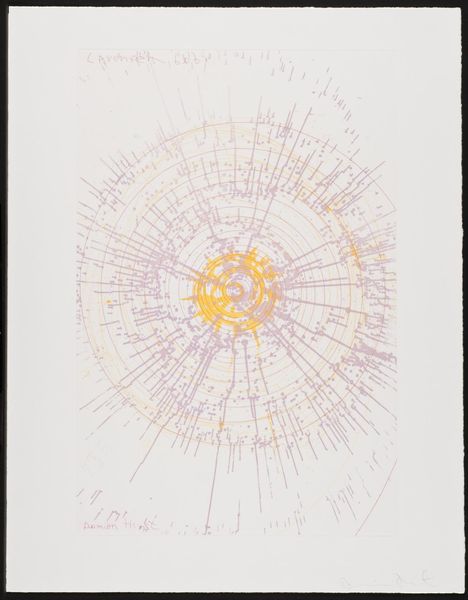 Editor: This is Damien Hirst’s, “There’s more to life than making jam and having kids.” It features concentric circles with off-shooting lines. What does this image evoke for you? Curator: It resonates as a powerful symbolic challenge to traditional roles, those lines extending disruptively, like expanding possibilities. What memories or associations does the title bring to mind? Editor: A kind of domestic constraint, versus a broader range of experience. Curator: Precisely. The radial design could signify both confinement, with the cyclical repetition, but also an explosion outward, beyond those limiting expectations, wouldn’t you agree? Editor: That’s an interesting duality; the piece feels both restrictive and expansive at the same time. Curator: Exactly. Hirst often uses visuals to challenge social norms, tapping into our collective consciousness surrounding life's choices. It’s a potent visual statement. Editor: I’ll definitely be thinking about that duality, thanks.