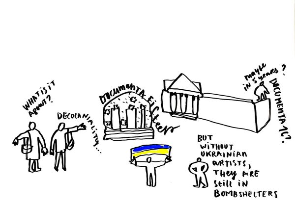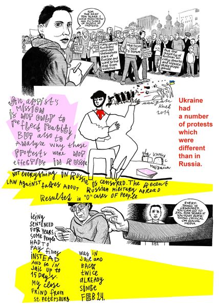 Editor: So, here we have Alevtyna Kakhidze's "Untitled" drawing from 2022, rendered with pen and ink. The frantic energy really strikes me; it's like a snapshot of hurried movement. What’s your initial read of this piece? Curator: It's a provocative sketch, isn't it? What interests me immediately is how the artist uses such simple materials – pen and ink – to depict a complex social reality. Think about the accessibility of these materials; readily available, portable. What does that say about the creation of art in the context of displacement? Editor: That's a great point, it makes you think about the context in which this work was made! It feels immediate and raw, like a dispatch. Does the explicit text within the image change how we should perceive the scene? Curator: Absolutely. Consider the textual component – the handwritten phrases interspersed within the figures. Words become material, adding another layer to the visual narrative. How does this blend of text and image challenge our traditional notions of drawing as simply a visual medium? Does it blur the line between journalism and art? Editor: I guess it forces you to engage with it more directly than a purely visual image might. Curator: Precisely! And consider the labour involved. The repeated lines, the filling-in of forms with solid ink... it's a deliberate, almost frantic process. How does this repetitive, almost desperate act of mark-making speak to the broader socio-political context of the artwork? What commentary does the materiality offer about our consumption and dissemination of the work. Editor: That makes a lot of sense, framing it in the wider cultural context. Seeing the work through the lens of its materials really changes how I appreciate it. Curator: Agreed. Examining the process and materials allows us to understand art not as a detached object, but as a product of specific labour, social conditions, and political realities.