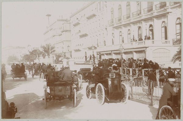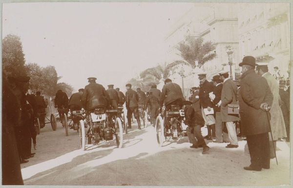 This photograph captures gemotoriseerde driewielers—motorized tricycles—at the starting line of the Nice-Magagnosc race. The sepia tones evoke a sense of nostalgia. The eye is drawn to the repetitive forms of the tricycles, their wheels creating a rhythmic visual pattern disrupted by the presence of spectators. Delizy employs a composition where the machines and their riders are tightly packed, suggesting anticipation. The structure is defined by the contrast between the mechanical precision of the tricycles and the organic arrangement of the crowd. This tension destabilizes the conventional viewpoint; machines challenge the human element, reflecting the early 20th-century fascination with technology. Delizy does not merely document the event; he presents a visual narrative deeply embedded in the cultural discourse of progress and modernity. The photograph serves as a historical artifact and a semiotic text, embodying the complex relationship between man, machine, and movement.
