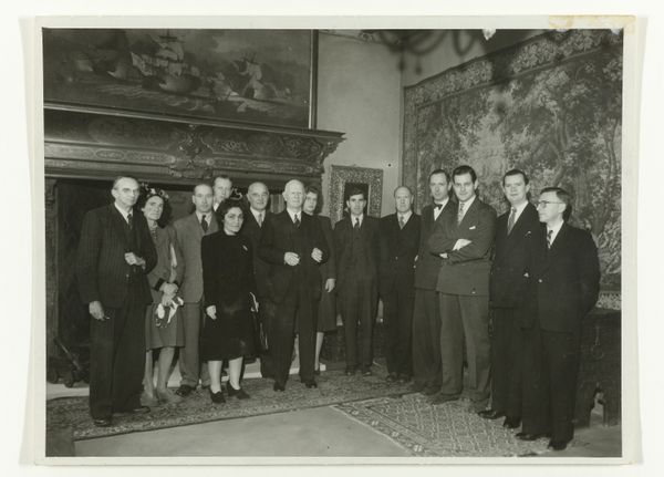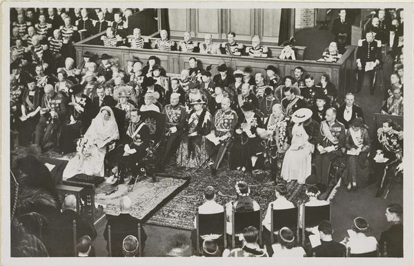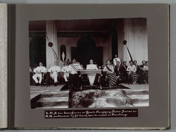 Editor: This gelatin silver print is titled "Staatsiefoto van Jhr. Mr. B.C. de Jonge, gouverneur van Nederlands-Indië, en mw. A.C. de Jonge - baronesse van Wassenaer aan Semarang", possibly taken between 1932 and 1939 by Otto Hisgen. It has a formal, staged feeling to it. What can you tell me about it? Curator: The photograph certainly exudes a sense of rigid formality, but it's precisely that rigidity which speaks volumes. Look at the composition – the clear segregation between the European colonizers and the indigenous population, visually reinforcing a power dynamic. The photograph, in essence, documents a performance, a carefully constructed display of colonial authority. Editor: It definitely feels posed. There’s a stiffness, and as you point out, a division. So, how do we move past the surface level reading? Curator: Ask yourself, what isn't being said? Consider the photograph as a tool, consciously employed to propagate a certain image of Dutch colonial rule, not just in the eyes of the colonized, but for audiences back in Europe as well. Think about the implicit messages embedded within the carefully chosen attire, the posture, and the setting. Where is this taking place, what sort of encounter is documented? Editor: So, it's not just a portrait, but a statement? Is the act of taking the picture almost more important than the picture itself? Curator: Precisely. The photograph, far from being a neutral record, is an active participant in shaping and solidifying the existing colonial structure. How do you think this image functioned for the Dutch audience back home? What narratives did it perpetuate or obscure? Editor: I suppose it showed a controlled, ordered colony... a successful enterprise. It hid a lot of complexity, to say the least. It’s amazing how a seemingly simple photo can be so loaded. Curator: Indeed. It compels us to deconstruct the layers of meaning and consider the unspoken narratives of power, privilege, and subjugation. Images like this remind us of our need for critical examination of history, from different points of view.