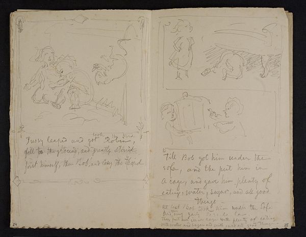 Editor: So, here we have Lorenz Frølich's "Forskellige illustrationsudkast til H.C. Andersen, 'Dynd-Kongens Datter'," made in 1869 with pen and ink on paper. The sketches are quick, but they hint at a fantastical story. What do you see in this piece, especially in relation to its time? Curator: What strikes me is how Frølich uses these sketches to engage with Andersen's story about a complex female figure born from the swamp. We see figuration which might also signal an interrogation of societal norms through fairytale. How does he visually negotiate themes of otherness and transformation that resonate with, say, feminist readings of fairy tales? Editor: That's interesting. I hadn’t considered the feminist angle, but a woman born from the swamp does subvert traditional origin stories. Do you think Frølich intended this subversion or was he merely illustrating the story? Curator: The 19th century was a hotbed of social and political change. By visualizing this narrative, Frølich perhaps offered a visual commentary on identity and social expectations. The swamp, a space of the "unnatural," could be read as a challenge to dominant social structures and gender roles, don’t you think? It seems there is something deliberately radical and unconventional in his aesthetic choices. Editor: Yes, now that you point it out, the sketch-like quality itself defies the highly polished academic art of the time, reinforcing that subversive theme. Thanks for pointing that out! Curator: It's a privilege to interpret these narratives in ways that address enduring questions. Art helps us to address contemporary social challenges through revisiting historical and social conditions of the work. Editor: Absolutely, I will be sure to dig deeper into this in my art history course.