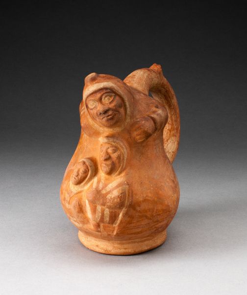 Editor: This striking ceramic piece is entitled "Handle Spout Vessel in the Form of a Crouching Figure with Human Heads Attached to Side" by the Moche culture, dating roughly from 100 to 500 AD. The almost solemn facial expression gives it such presence. How do you approach interpreting the power of this ceramic figure? Curator: Let us consider the relationships between its formal elements. Notice the stark contrast in textures; the smoothness of the primary figure against the matte surface of the applied heads. Does that create a visual hierarchy? What of the monochromatic color scheme? Editor: I see that the primary figure is a lighter tone, which might suggest its dominance, but the two other heads create almost a balance within the whole form. Curator: Precisely. Consider too how the handle, shaped almost like a stirrup, functions not only practically but also aesthetically. How does its curvature interact with the rounded form of the crouching figure? It echoes the rounded heads, doesn't it? Editor: Yes! It also acts as a visual bridge connecting the spout to the main figure, integrating the utilitarian function into the sculptural aspect. I initially only considered the faces, but I see now that the other visual aspects help provide so much balance to the overall piece. Curator: Indeed. And by considering the relationships between form, texture and composition, we can perhaps perceive a greater harmony at play than might appear at first glance. Every shape leads the viewer somewhere else. Editor: I now appreciate how its form speaks so strongly, independent of external references. Thank you! Curator: My pleasure. This exercise emphasizes how art speaks through visual language, and this work proves an exceptional case study.