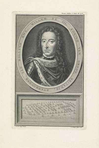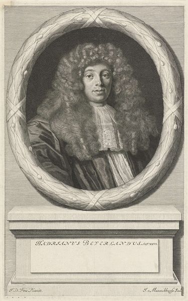 Richard Collin created this print of Johannes Paulinus Olivecrants at the age of 55, a testament to the fashion and formality of its time. The composition is structured around an oval portrait, framed by inscriptions and decorative elements, all meticulously rendered with fine lines. The subject, Olivecrants, is presented with an emphasis on his elaborate wig and draped clothing, indicative of status and intellect. Note how Collin uses the texture of the engraving to create depth and shadow, particularly in the curls of the wig and the folds of the fabric, which contrasts with the smoothness of Olivecrants’ face. This attention to detail serves not merely to depict likeness but to convey ideas about identity and social standing, engaging with the semiotic language of portraiture. The Latin inscriptions that surround the image enhance this sense of formality, imbuing the portrait with a sense of classical learning and authority. The enduring appeal lies in its ability to capture a moment in time, inviting us to consider the values and visual codes that shaped the early modern world.
