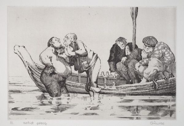 Editor: We are looking at Anne Kutka McCosh’s print, "The Rescue," created sometime between 1935 and 1939. It depicts a family in a small boat during a storm, rendered in pencil. There's a real sense of urgency and desperation. What do you see in this piece? Curator: I see a narrative steeped in resilience, survival, and possibly the socio-political anxieties of the late 1930s. Consider the context: the Great Depression, the looming threat of war. This family braving the storm could be a potent metaphor for the challenges faced by many. Notice the stark contrast between the figures huddled in the boat and the beckoning figure onshore; it invites questions of who is being rescued and from what? Editor: That's interesting. I hadn't considered the broader historical context. Do you think the artist is making a specific statement? Curator: Perhaps not a singular statement, but rather inviting us to contemplate the anxieties of a society on the brink. The precariousness of their situation, visualized through the storm and fragile boat, could reflect economic hardships, displacement, or even the growing threat of fascism. What is the gender dynamic that may reflect some form of inequality? Editor: That makes me see it differently. It's not just a dramatic scene, but a reflection of societal fears and struggles. Curator: Exactly! By viewing the artwork as more than just an image, we uncover rich narratives concerning socio-political conditions, resilience, and the complexities of human survival. It compels us to delve into history to really grasp it. Editor: Thank you. I see it's not enough to look only at what's in front of us; we also need to consider the context and deeper implications. Curator: Precisely, every element contributes to the meaning. Consider the medium: a print, implying mass production and dissemination—was this a message intended for a broad audience? Food for thought.