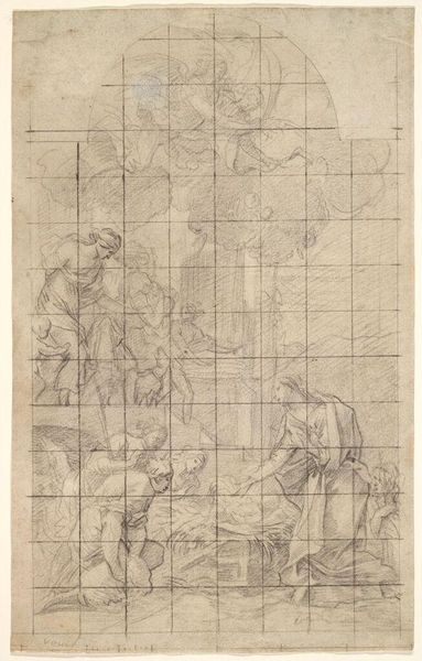 Editor: So, here we have Ludovico Carracci's "The Last Communion of Saint Jerome," a pen and brown ink drawing on paper, dating from 1555 to 1619, now residing at the Metropolitan Museum of Art. It feels…unfinished, raw, yet powerful. What do you see in this piece, especially considering its historical context? Curator: I see a powerful statement on the institutional role of the church. Look at how Carracci frames Saint Jerome's final moments. The composition, even in this preparatory state, stages the act of communion not merely as a personal sacrament but as a public demonstration of faith, reinforcing the Church’s power through the performance of ritual. Editor: The way you highlight that staged aspect makes me consider how the figures surrounding Saint Jerome play into the Church's agenda, you know? What were some specific socio-political forces at play influencing this depiction of a saint’s last communion? Curator: Think of the Counter-Reformation. The Catholic Church, facing the rise of Protestantism, was keen to reassert its authority through grand artistic expressions. The emotional intensity of scenes like this served to reaffirm the sanctity of the sacraments and the vital role of the priesthood in mediating divine grace. It’s carefully constructed visual propaganda. Editor: So, the "unfinished" quality might also be deliberate, focusing on conveying that powerful message rather than perfecting minute details? Curator: Precisely! The rawness amplifies the urgency, inviting viewers to witness this moment of faith actively. Plus, the presence of the grid implies it's a study, a work to prepare another important image. Consider the implications for viewers who first saw the finished piece. How might this staged authenticity impacted their understanding of faith and the Church's place in their lives? Editor: Wow, framing it as staged authenticity… That’s definitely changed my perception. Thanks, that really illuminates the cultural weight embedded within this seemingly simple drawing. Curator: And for me, considering your perspective helps to see the impact the style of the sketch makes on the narrative and it’s connection with religious practices.