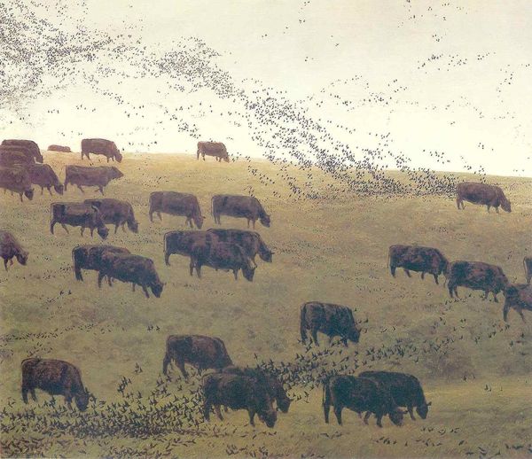 Editor: Here we have Eugène Boudin’s "Cows in a Pasture, Deauville,". It’s a fairly simple painting, cows resting in a field. How should we interpret this very pastoral scene? Curator: Consider the socio-economic shifts of 19th-century France. As urban centers grew, paintings of rural life often idealized a disappearing world, masking the realities of agricultural labor. How does Boudin's portrayal engage with or perhaps even subvert these romanticized views? Editor: That's a different way to look at it; it's not *just* cows. It makes me wonder what Boudin really thought about rural life. Curator: Exactly. By questioning the idyllic, we can uncover deeper meanings about the complex relationship between humans, nature, and societal progress.