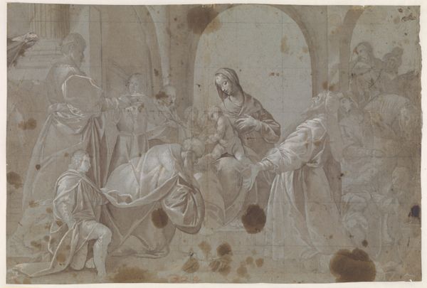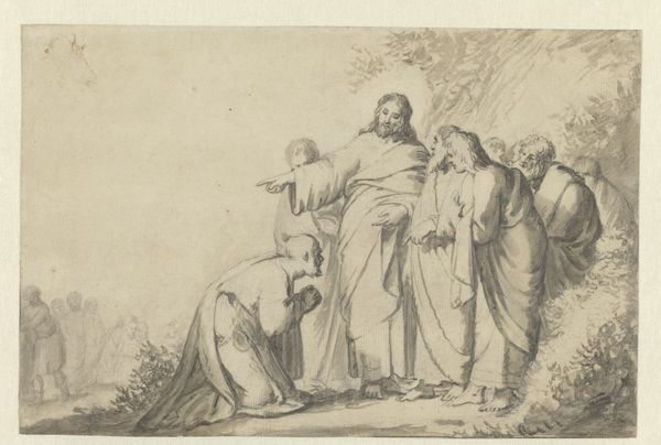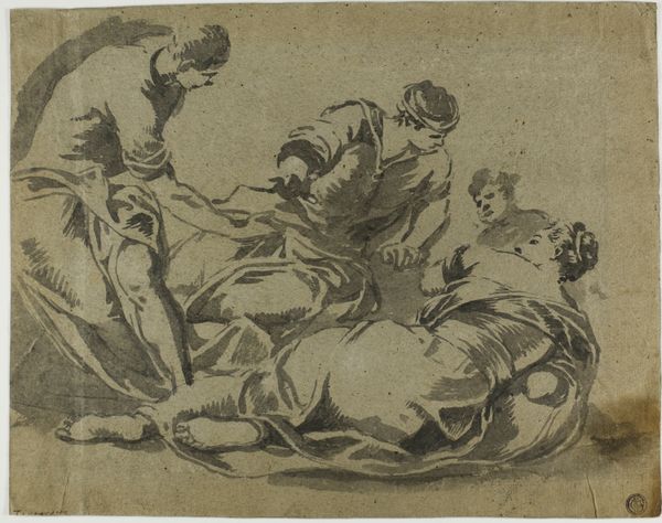 Curator: What strikes me immediately about this work, “Figures Surrounding a Man Lying on the Ground," is its tentative quality. It has the feeling of a first thought sketched quickly. Editor: The historical and political weight it conveys hits me first. Seeing a man prone, seemingly lifeless, surrounded by figures in various states of distress… it evokes themes of power, vulnerability, and societal structures. It's like witnessing a crucial moment in history. Curator: Indeed. The anonymous artist working in the 1700s-1800s uses a delicate pencil to map out the composition, exploring chiaroscuro, how forms appear against the light. It’s a study in light and shadow, and its impact on perception. Notice the level of detail in the foreground figures versus the background. Editor: And consider the societal context! Think about the period it was made – a time of immense social upheaval and stark class disparities. Who is this man on the ground, and who are the figures around him? Are they mourning him, or is it a different dynamic? Are they symbols of disenfranchisement? Are they subjects seeking freedom? The art serves as a stage for those discussions. Curator: The very act of sketching suggests a certain kind of labour and a mode of artistic production distinct from say, finished oil paintings. It offers a glimpse into the creative process, highlighting the role of the artist as a maker. We are invited to examine the labour and intent embodied in each line. Editor: And looking at it from an intersectional lens, it prompts us to investigate who is included and, importantly, who is excluded from the narrative. The rendering, even in its rough state, offers insight into prevailing cultural norms of the era. This piece facilitates conversations about history and challenges assumptions. Curator: Ultimately, this preliminary drawing on paper brings forth questions about how art is constructed, both physically and conceptually, focusing our attention to art making itself. Editor: Yes. And by confronting those perspectives and linking art history to social awareness, "Figures Surrounding a Man Lying on the Ground" serves as a platform for examining the world we still inhabit.