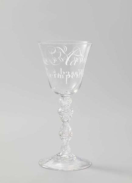 Curator: This exquisitely engraved kelkglas, dating to around 1795, presents a fascinating convergence of political and symbolic imagery. Its creation coincides with the alliance between the Batavian Republic and Revolutionary France. Editor: My first thought is that the images appear quite playful despite the historic associations! I am immediately drawn to the depiction of two childlike figures and some other cryptic details. The image quality lends a soft, almost dreamlike appearance. Curator: Indeed. Given its potential ties to the Franco-Batavian alliance, the imagery likely refers to these historical events while referencing Freemasonry with the presence of hidden, moralizing metaphors. We are really looking at a commentary of the socio-political landscape of the time through the allegorical motif, that is common to neoclassicalism Editor: So the symbols within the engravings are critical to interpretation, as the object seems intended for something more than mere drinking. Look at the hat and tools. Their integration with what appear to be putti hints at transformative ideology; are these meant to signal liberty, equality, or maybe fraternity through commonplace iconography? Curator: The key, in my opinion, lies in discerning exactly how contemporary viewers might have interpreted this visual language. After all, it reflects more than simple decoration, but represents cultural memory around this historic time through accessible symbols, and this would shape public understanding during an age of significant change and socio-political reformation. Editor: I’m struck by how this vessel embodies the spirit of its era. Even in the choice of material - clear, elegant glass lends itself to elaborate, if subtly rendered symbols. What do you make of the choice to depict those complex messages so delicately, if not to cloak the message as not to agitate more conservative viewers? Curator: Precisely! Through it, one can analyze and better understand the artistic and socio-political subtleties through public iconography of the time. This glass does double-duty by representing itself as both an artefact, as well as a voice representing sociopolitical context, allegories, and hidden or subtle cultural symbolism. Editor: Thinking about its presence here today is amazing because now viewers can still witness not only refined artistry, but access what this era symbolizes and inspires!