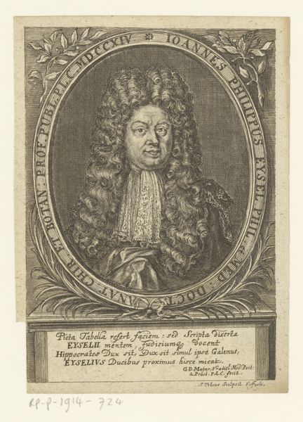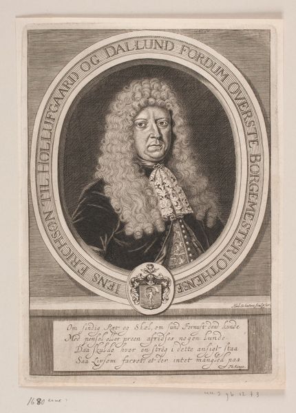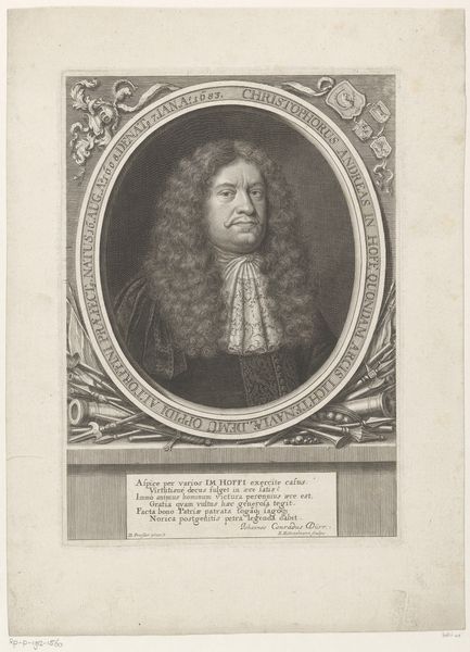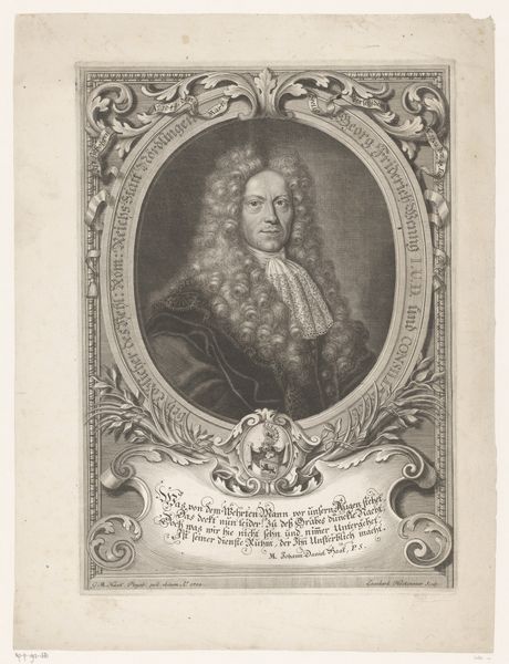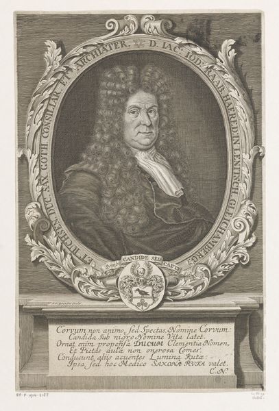 This print portrays Christian Friedrich Meurer, and was made by Johann Christoph Boecklin in the late 17th century. It's rendered through engraving, a printmaking technique where lines are incised into a metal plate, which is then inked and pressed onto paper. The precision and detail achieved through engraving are striking; you can see it in the intricate rendering of Meurer's wig, the delicate lace collar, and the heraldic crest below. This wasn't a quick process. Engraving demanded immense skill and time, reflecting the value placed on meticulous craftsmanship. Prints like these played a crucial role in disseminating images and information in an era before photography, but were also a way of demonstrating status. Consider how the material—the metal plate, the ink, the paper—all contribute to the final image, and the labor required for this piece. This challenges us to think about the social context of its creation, and how we understand the relationship between craft, art, and the hierarchies of production.