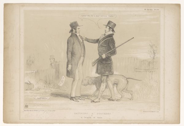Curator: Welcome, everyone. We're standing before a lithograph by Honoré Daumier from 1857, titled “- Listen... I saw a hare over there... - Was that a long time ago? - Not at all... it was less than three months ago...,” which is part of his series Croquis de Chasse. Editor: It strikes me immediately as an image steeped in social critique. The lean, almost grotesque figures, especially juxtaposed in their attire – the dandyish hunter versus the rustic guide – feels immediately satirical. The heavy lines used to create these forms highlight class tensions inherent to the era, no? Curator: Absolutely. Daumier was a master of social commentary, and this work encapsulates that. Note the stark contrast in attire, a top hat versus a simple peasant’s garb. It points directly to the socio-economic disparities prevalent during that time in France and especially how the aristocratic class views its dependants. The artist also often makes use of stock character that is typical of Commedia dell'Arte! Editor: Which returns us to process. The use of lithography would have made these images widely accessible and affordable. I imagine that helped to spread these politically loaded statements? Curator: Precisely! Lithography was a democratic medium, a way to disseminate commentary on the absurdities and injustices Daumier witnessed. He's holding a mirror to society and pointing out its flaws through recognizable stereotypes. Editor: Even the landscape seems deliberately bleak and featureless. There's a sense of futility, or perhaps it is just mocking the elite pastime. The entire enterprise of "leisure" gets called into question when viewing the slumped hunting dog. Is it longing for something more useful to do? Curator: A wonderfully sharp interpretation. One could see the slumped dog as a symbol of this societal malaise, a yearning for genuine engagement rather than superficial pursuits. In Romanticism there is also frequently found the Vanitas elements of time passing us. Editor: It seems impossible to divorce form and content here. Daumier’s technique underscores the print's accessibility as well as its critical view of leisure and social classes, creating a particularly impactful statement. Curator: And it showcases, as well, how timeless the observations of an artist can be in calling out hypocrisy and injustice that may transcend context. Editor: Indeed. A keen eye for the materials and production of the print is just as valuable as looking into the visual history and the symbolism. Thank you.