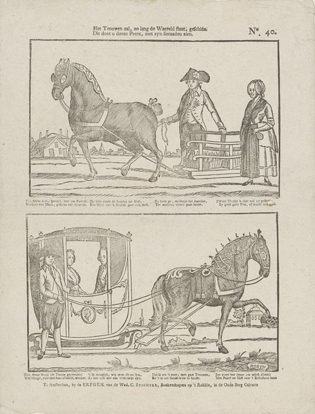 Editor: Here we have a print entitled "Komt, jongelingen komt, wilt gy de wapens dragen…” dating from 1842 to 1866, made with pen and engraving by weduwe C. Kok-van Kolm, currently residing in the Rijksmuseum. There’s a decidedly martial air to it – lots of proud men on horseback. What do you see in this piece? Curator: Immediately, I'm struck by the romanticism, how it uses the image of the soldier as a symbol of national identity and pride. The repetition of the verses, paired with the individual figures, creates a sense of both unity and personal choice in serving the nation. Do you see any particular details that resonate with that theme? Editor: Definitely the confident posture of each rider, but the framing, the way the images are laid out like cards, it seems to normalize these archetypes… but cards are used for chance, right? So perhaps it's talking about fate? Curator: An astute observation. It’s less about chance, I believe, and more about accessibility of military roles: curassier, ulaan, hussar, or lancer. Each depicted as equally glorious, with corresponding verses suggesting valor and sacrifice. In the mid-19th century, with rising nationalism across Europe, visual rhetoric served to inspire patriotism. The print isn't just decorative; it’s a recruitment tool and idealogical expression. Does knowing that change your view? Editor: Yes, it clarifies why those verses seemed so declarative, like calls to action! And framing each class of soldier with similar poses implies, I think, an invitation… and the romance element gives them an edge. I hadn’t considered how directly art could function in civic life like this. Curator: It's a potent reminder that images often carry specific intent, deeply entwined with cultural and historical context. Considering what the artist hopes to convey brings depth. Editor: Absolutely! Thanks for unlocking the historical and symbolic weight of this print.
