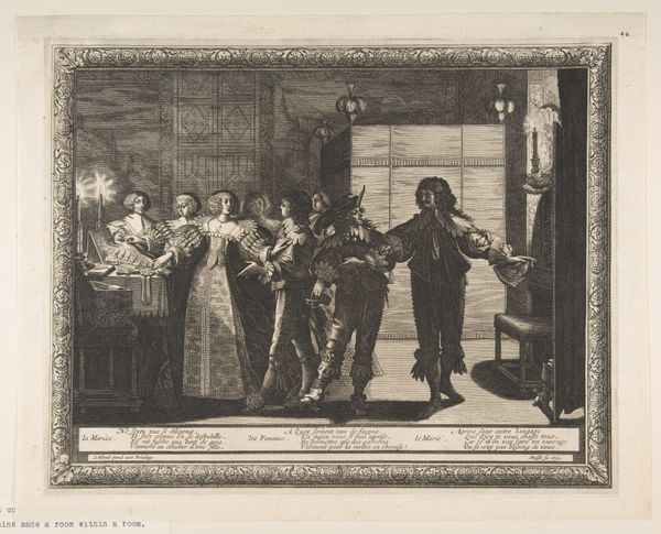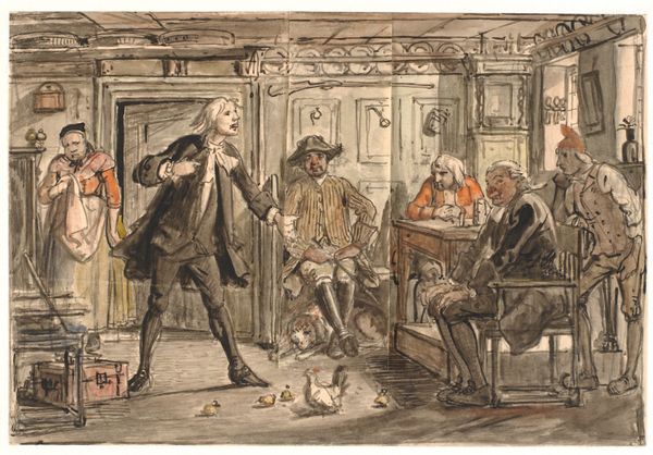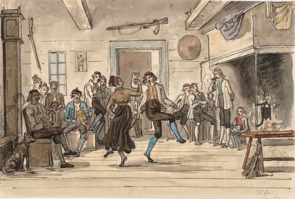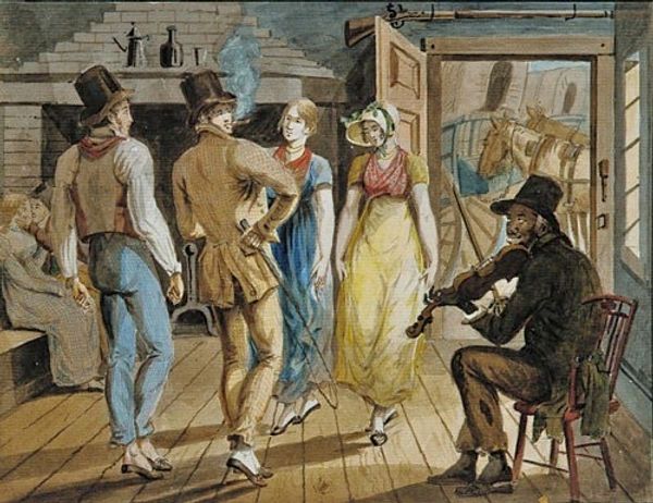 Curator: This is John Lewis Krimmel's "Merrymaking at a Wayside Inn," created between 1811 and 1816. You can find it at the Metropolitan Museum of Art. Editor: It feels almost stagey, doesn’t it? Everyone poised in their finery like a scene from a traveling play, caught in the liminal space of a coaching stop. The color washes create this sense of spontaneity too, while everything also feels deliberately placed. Curator: I find it endlessly charming – this peek into a bygone era of leisurely travel. Krimmel captured the spirit of the time. Think of the clothing! All those layers—the craftmanship, even. The stitching… someone’s labor went into every single thread. Editor: Precisely. And look at the violinist in the doorway. Note how the narrative relegates music-making, the work itself, to the periphery, literally to the doorway; the artfulness disappears behind the guise of merriment. Even though it enables the leisure on display! Who gets to labor? And who has the freedom to while away the time at an Inn, drinking, dancing, making merry... those distinctions matter! Curator: Ah, yes, the fiddler. I always saw it as Krimmel inviting us to focus our attention there... Editor: Well, what better subject than labor itself? Krimmel had a real appreciation of craftsmanship! Curator: In some ways. Yet he elevates a fiddler—an artist himself, no?—above sheer function. Krimmel wasn't making an argument here. Editor: But the very depiction makes the point! These are the wheels on which society runs. Take a look at those travelers again, notice those textiles and embellishments... the artist does. Curator: You have certainly made me think differently. I see the social dynamics so much more vividly now. Editor: Ultimately, these objects are also a story. Not just art for art's sake, but social record and legacy as well. A beautiful dance between intent and material truth.