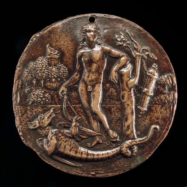 This bronze plaquette, “A Nymph on a Dolphin,” was made by Francesco Marti in the early 16th century. The work is a testament to the artist's mastery of bronze casting, and its material qualities significantly influence its appearance. Bronze, an alloy of copper and tin, lends a warm, reddish-brown hue and a sense of durability to the piece. The casting process involves creating a mold, pouring molten bronze into it, and allowing it to cool and solidify. The level of detail achieved speaks to Marti's skillful handling of the material. This was a laborious process. Each stage involved specialized knowledge and physical effort. The plaquette's smooth surface and intricate details invite tactile exploration, despite its small scale. The depiction of a mythological scene, with a nymph riding a dolphin, evokes a sense of classical antiquity. The bronze medium reinforces this connection, as it was widely used in ancient Greek and Roman sculpture. Considering this plaquette through the lens of materiality and making allows us to appreciate the artist's technical skill and the cultural significance of bronze as a medium.