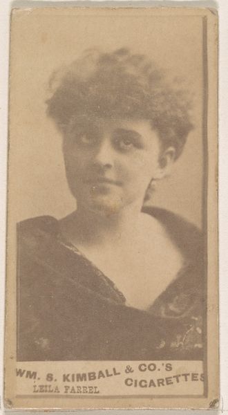 Curator: What strikes me immediately is the gentle wistfulness, a fleeting melancholic expression that reminds us of the ephemerality of the stage and, perhaps, of beauty itself. Editor: I can see that! There is a tenderness in how the light falls. This is "Miss De Villiers, from the Actresses series (N203)," dating back to 1889 and produced by Wm. S. Kimball & Co. Curator: Actresses on cigarette cards! There’s a real commentary there, don’t you think? Beauty packaged and commodified for fleeting enjoyment, just like a cigarette. It’s brilliant and sad all at once. I suppose such photographic prints could have been some early form of mass-produced devotion. Editor: Precisely! These images served as symbols of allure, accessible to anyone purchasing the cigarettes. She’s very stylish; there's almost an intentional blurring of line, of form... perhaps a nod to the artistic photography trends of the era. Curator: Oh, absolutely. The soft focus makes it dreamlike. I am reminded that portraits in mass culture filled a kind of collective memory before personal photography was really available. Editor: The lighting reinforces that hazy romantic quality. The subtle details like the fabric of her gown and the slight smile feel incredibly intimate considering it was meant for mass consumption. Do you think she recognized that significance? Curator: An actress… a player… knows their image is currency! And I suppose she contributed by being her own cultural phenomenon. The slight turning of the head implies confidence, an awareness of being seen and admired. Editor: It certainly makes you wonder what the performance was and what symbols are being evoked from theatrical history! Curator: Yes, quite a rich historical capture when you remember how widely these images were disseminated. Editor: Right, this card preserves a very small, almost insignificant moment in art history when consumerism became art history. Curator: Perhaps we shouldn't so quickly separate consumption from "high" art! It may simply be that we have more work to do untangling such connections.