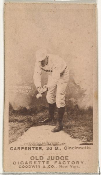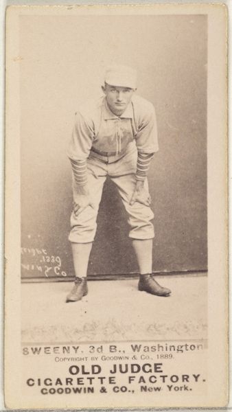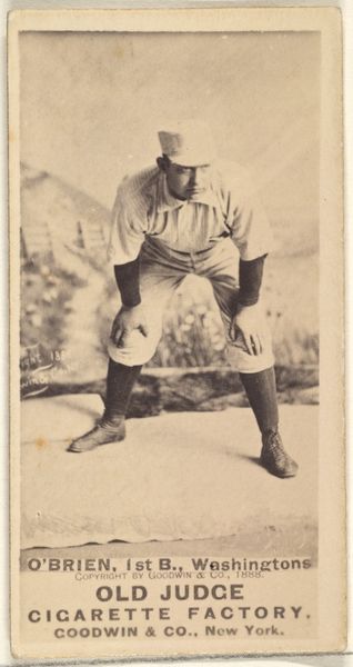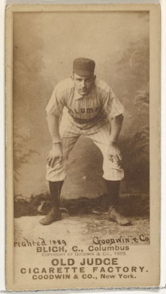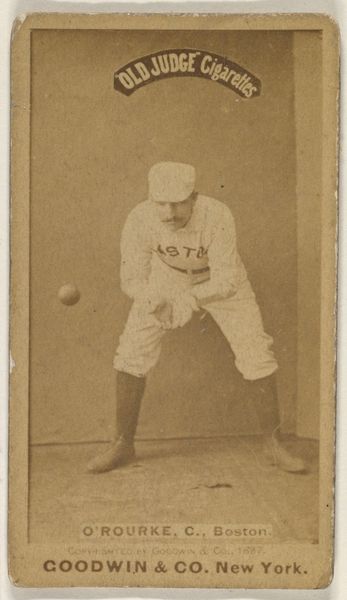 Curator: This image presents us with “Decker, Catcher, Philadelphia” from the Old Judge series, created around 1889 by Goodwin & Company. It’s a print, likely after a drawing, used in advertising for Old Judge Cigarettes. What strikes you initially? Editor: A certain melancholic feeling, definitely, emanating from the sepia tones and the very pose itself. The catcher seems poised, but also weary. The print's subdued aesthetic enhances this air of a bygone era. Curator: The sepia tone connects it directly to its origins – the late 19th century. But look at Decker’s uniform, the "PHILA" across his chest. What does that represent, beyond simply the city? It’s more than civic pride, isn't it? Editor: Precisely. The uniform, reproduced and distributed through these cards, performs an interesting function. Mass-produced and marketed with cigarettes, these cards democratized the image of the athlete, embedding baseball within a broader consumer culture. This makes it a political artifact as well as a commercial one, revealing how sport helped create collective identity. Curator: Goodwin & Co. weren’t just selling cigarettes; they were selling a lifestyle, an ideal of American masculinity intertwined with the rising popularity of baseball. What symbols speak to that construction here? Editor: His firm stance, his focused gaze... It's about duty, diligence. Yet there's an undercurrent of vulnerability as he waits, ready but exposed, creating this potent mixture of grit and humility emblematic of early baseball ideals. Curator: And how about the cigarette tie-in? It seems incongruous now, doesn't it? This image intended to encourage athletic prowess associated with something patently unhealthy. Editor: Absolutely. This juxtaposition is rife with meaning, embodying both the allure and anxieties surrounding progress and industrialization during that period. Curator: Ultimately, “Decker, Catcher, Philadelphia” captures a moment when commerce, sport, and identity were being actively shaped in America, wouldn’t you agree? Editor: Indisputably. It presents this fascinating nexus of societal forces. The image speaks of much more than merely baseball. Curator: A poignant relic of the game and an advertisement for an emerging identity, subtly preserved within a tobacco card.