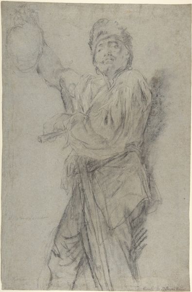 Giovanni Battista Piazzetta made this drawing, Caliph Aladin and His Counselors, using graphite on laid paper. Graphite, derived from naturally occurring mineral deposits, lends itself to both delicate sketching and bold shading. Here, Piazzetta uses it to capture a sense of dynamism and immediacy, befitting the imagined scene. Notice how the graphite is applied in varying densities to create depth and volume. Look closely, and you'll see the texture of the laid paper subtly showing through, adding another layer of visual interest. Drawing has always been fundamental to artistic practice. It is the means for artists to explore ideas, experiment with composition, and refine their vision before committing to a more elaborate and costly medium, such as paint. This drawing offers us a glimpse into Piazzetta's creative process, as he grapples with the interplay of light and shadow, form and space. It reminds us that even a seemingly simple medium like graphite can yield profound artistic expression.
