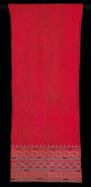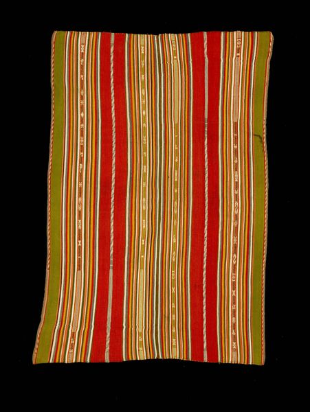 Editor: This vibrant textile, titled "Woman's Tzute," was created sometime between 1950 and 1960. It's made of woven cotton and held in the collection of the Minneapolis Institute of Art. The bold stripes and geometric patterns really jump out at you! What visual language do you see at play in this work? Curator: Well, the "Tzute" itself acts as a powerful symbol. More than just a simple head covering, in many Mayan communities, a Tzute functions as a vessel of identity. Can you see how the geometric abstractions, repeated across the textile, almost become a codified language? Editor: I can! Like, each stripe and diamond could represent something specific about the wearer or her community? Curator: Precisely! The weaver is embedding meaning through color and pattern. That central division reinforces a kind of duality, wouldn’t you say? Perhaps reflecting social roles or even spiritual beliefs held by this Maya community. Consider also how the repetition speaks to a collective memory. Does the color palette resonate with other visual elements from that culture? Editor: The vivid red certainly evokes warmth and energy and I suppose connects to many Indigenous cultures across the Americas... while the violet suggests a degree of nobility. Curator: Exactly, and notice the lower border's contrasting pattern. It almost anchors the vibrant field above, suggesting a link to ancestral heritage. I wonder, if you were to trace these designs across time, could you find echoes of older, shared traditions in the Maya people's identity? Editor: So much to consider about one seemingly simple woven cloth! Now I see this object less as decoration, and more as a layered narrative about Maya cultural memory and individual identity. Curator: Indeed. The “Tzute” whispers secrets to those willing to listen.